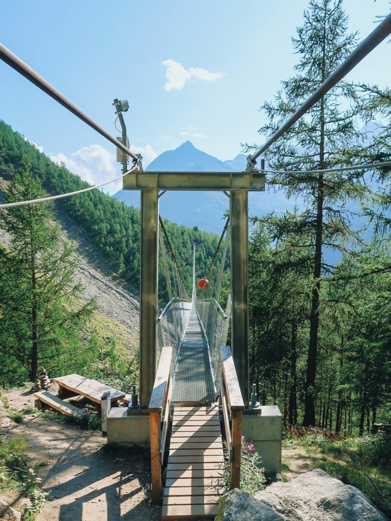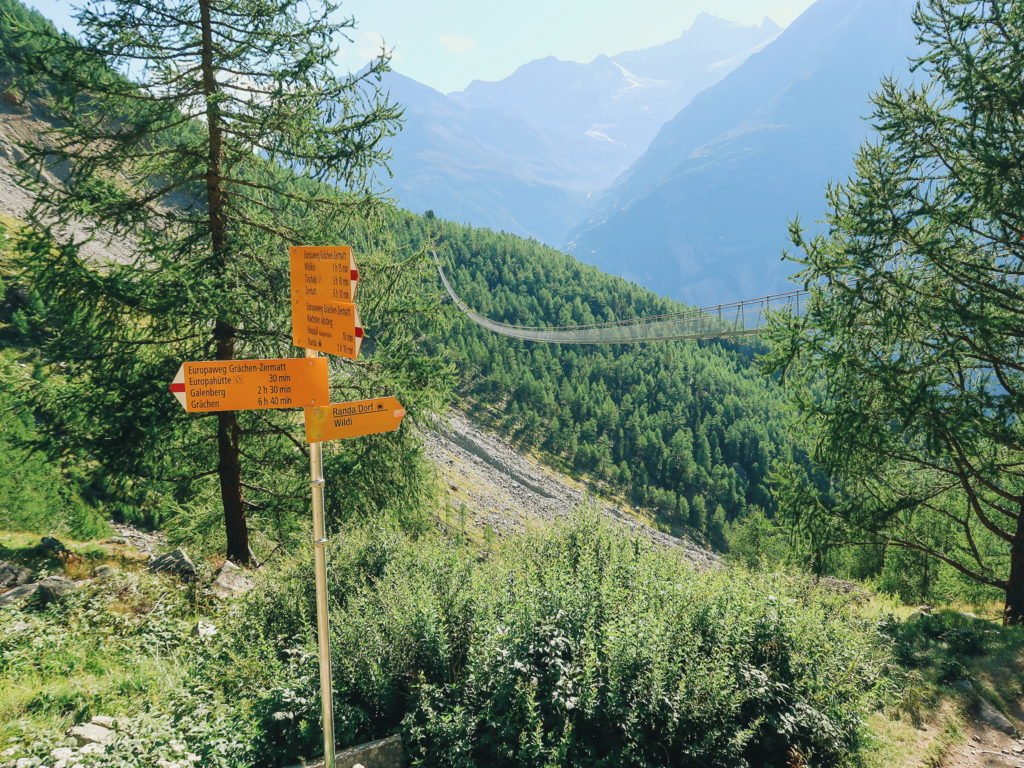 Continuando, depois de alguns quilômetros, a trilha que o mapa mostrava não era a mesma que a gente via na realidade. Esse "desvio" aumentou um pouco a quilometragem pro dia. Segundo baque no ânimo! A nova trilha nos levaria para a famosa ponte Charles Kuonen-Hängebrücke, a maior ponte suspensa por cabos de aço do mundo. Eram 494 metros de comprimento. Vou repetir, quase meio quilômetro de ponte!