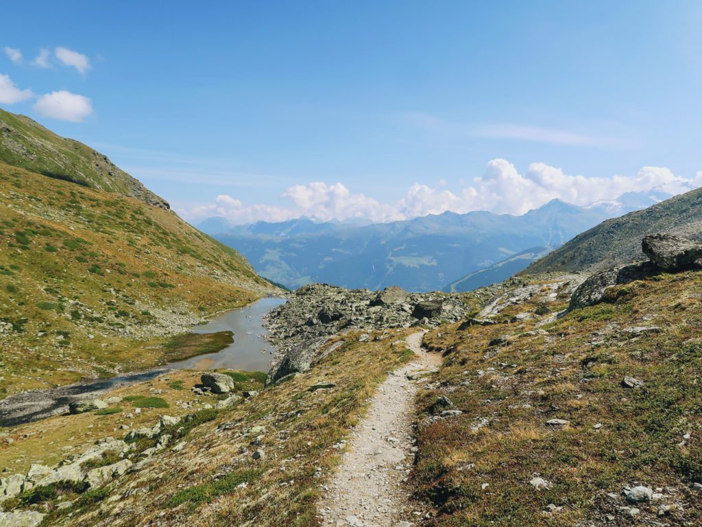 Continuando a subida, chegamos no trecho que dava a volta na montanha Twära (2660 m). A partir de lá, a trilha ficou bem, mais bem rochosa, com pedras levemente soltas e com alguns trechos sem marcação. Pra completar? Precipícios enormes! Esse caminho pelas pedras nos levaria até o nosso primeiro passe (col como eles chamam em francês) da viagem. Pra quem não sabe, o passe é uma pequena passagem, normalmente mais baixa do que as montanhas ao redor, que possibilita a passagem de um vale ao outro entre cadeias de montanhas. O passe da vez seria o Col de Augstbordpass (2894 m), que ligava o vale de Mattertal ao de Turtmmantal e o mais alto até então.