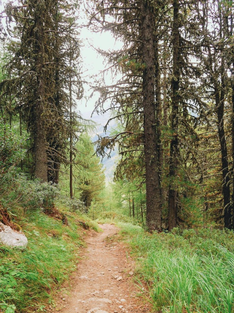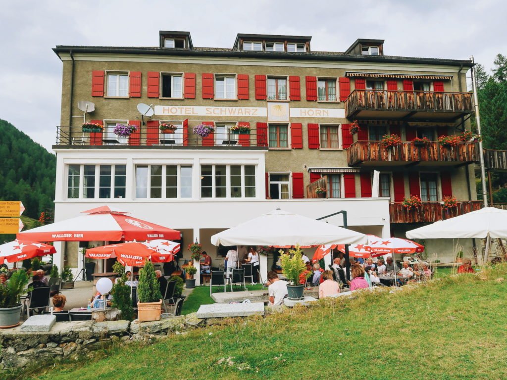 Falando de Gruben, a cidade fica no vale de Turtmmantal, cercada de montanhas e com vista privilegiada para o Glaciar de Tourtemagne. A cidade é tão pequena que só “funciona” no verão, não tem nenhum supermercado e não existe quase nenhuma opção de transporte público. Guarda essa última informação que ela vai ser importante mais pra frente.
