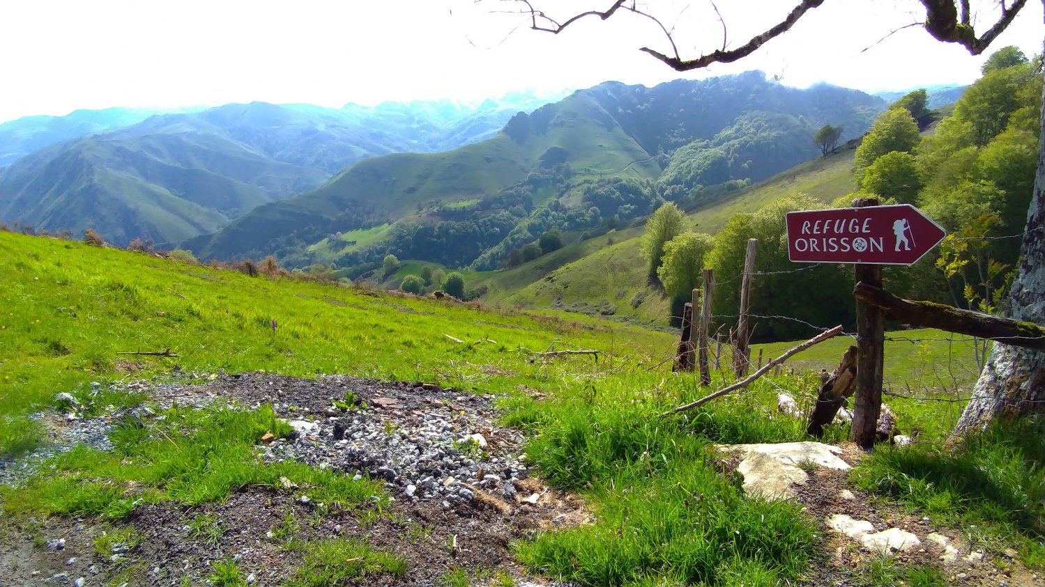 Sabendo que ao chegar no Collado Lepoeder teríamos atingido toda a subida dos Pirineus, a sensação de primeiro desafio cumprido foi enorme. Paramos um pouco num banco ao lado de totem com wi fi para pensar se desceríamos pela "floresta" ou pelo asfalto e lembrei da recomendação na Oficina do Peregrino em Saint Jean Pied Port para que todos descessem pelo asfalto. Seguimos a recomendação, mas antes uma pausa, em lugar protegido do vento, para um lanche...sentamos na grama e apreciamos o momento. ♥