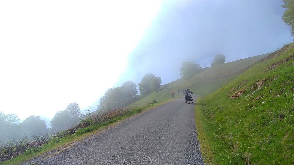 Seguimos subindo e o clima esfriando cada vez mais, então com as mãos bem agasalhadas, acabei tirando poucas fotos desse trecho inicial de 5km até o Refuge de Huntto e depois pelos 3k seguintes até o Refuge Orisson. Porém, apesar dos poucos registros, nesse trecho conhecemos vários brasileiros: A Márcia, peregrina de Uberlândia que com muitos sorrisos estava sempre nos incentivando e fotografando para mostrar para os amigos que ser ciclista no caminho de Santiago é bem mais difícil que peregrino. *risos* Obviamente discordei dela, pois não consigo fazer as longas caminhadas que eles fazem com a mochila nas costas. O Leonardo e sua esposa, casal de Campo Grande, que em certo ponto da subida de terra surgem no meu caminho. Eu estava empurrando a bicicleta e, de repente, sinto que ela ficou mais leve. Pensei: "Uai, o que houve?" Olho para trás e lá estava o Leonardo empurrando os alforges para me ajudar. Sim, existem anjos pelo caminho. ♥ O Pedro, ciclista de Jundiaí que dividiu chocolate comigo no meio da subida e seguimos conversando até o Refuge Orisson. O Francisco, pernambucano de Ouricuri que acompanhava o Pedro e seguiu com a gente até Santiago de Compostela. ♥