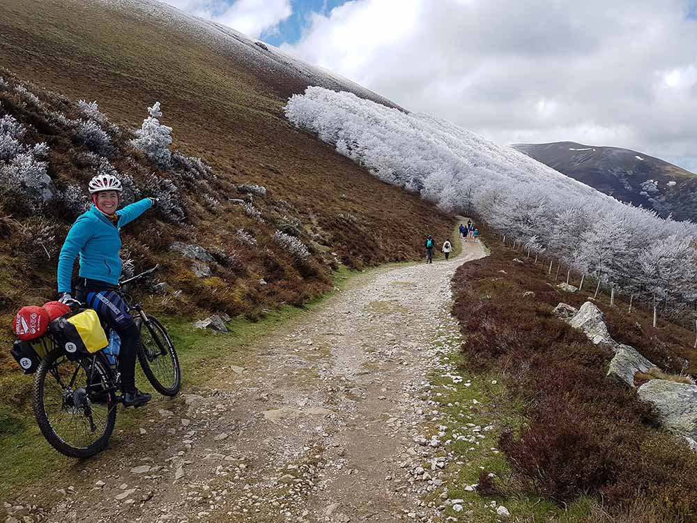 O vento continuava forte e o frio aumentando mesmo em constante movimento, pois é possível seguir pedalando pela maior parte do trecho, tive que vestir o último agasalho que restou no alforge para suportar a temperatura. Logo avistamos o gelo no topo das árvores e cobrindo diversos trechos de grama, então tinha a sensação de estar dentro de um congelador.
