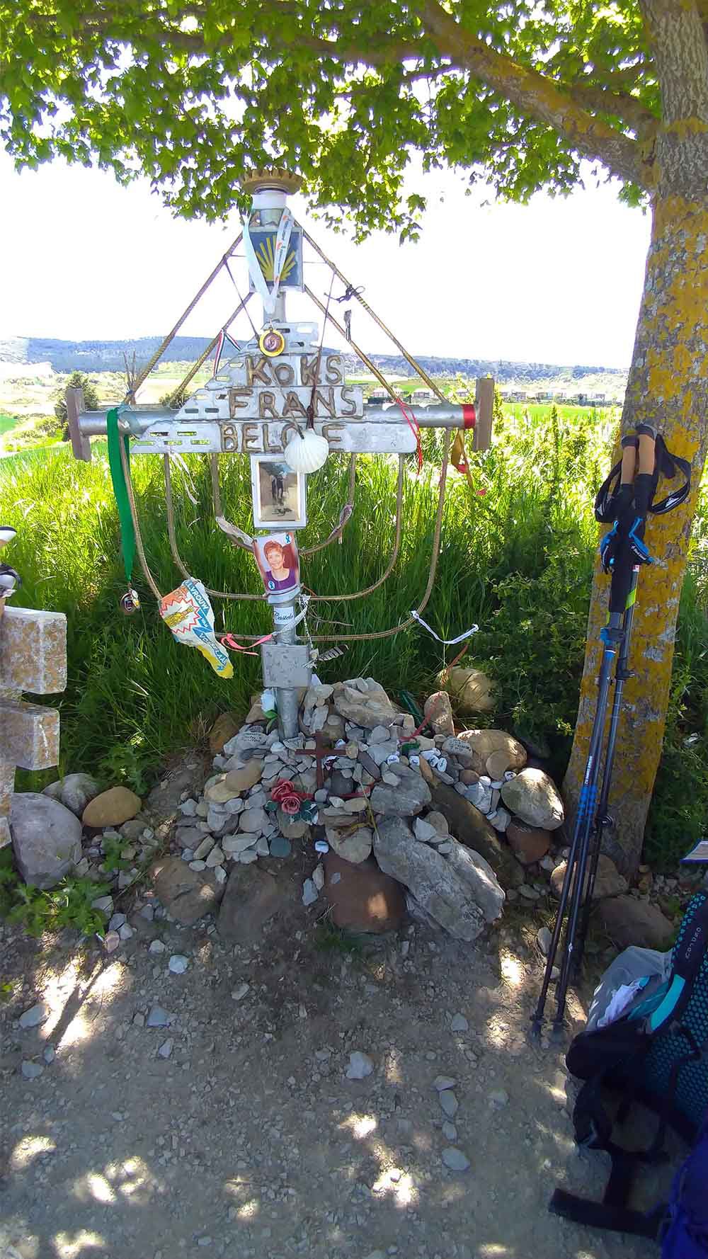 Debaixo de uma árvore encontramos alguns bancos e um grupo de peregrinos sentados descansando um pouco, então nos juntamos a eles na sombra para comer alguns petiscos e seguir rumo ao parque eólico no topo de uma serra que avistávamos ao longe. Nesse ponto há uma cruz em homenagem ao peregrino belga Koks Frans, que faleceu no local (Essas homenagens ocorrem com grande frequência ao longo do caminho).