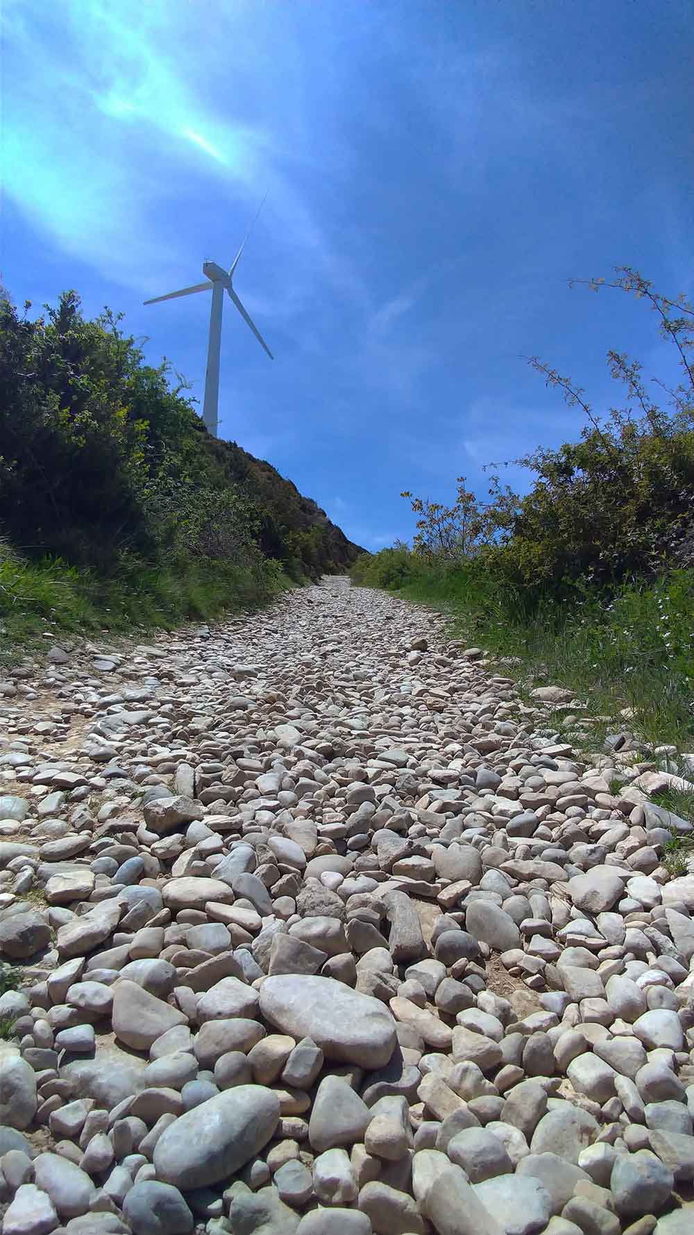 Nesse dia as hélices dos aerogerados estavam calmas, quase sem vento o que não as fazia girar. Sabia que a descida do Alto do Perdão é mais difícil do que a subida, com muitas pedras soltas, erosões no solo etc, então com as bicicletas pesadas resolvemos descer pelo asfalto até Uterga...alguns peregrinos também fazem essa opção.