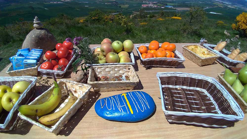 Pedras estão empilhadas ao lado da trilha, que acredito terem sido feitas por peregrinos muito pacientes e dedicados, e a frente encontramos uma barraquinha com frutas, chocolate, bebidas, onde paramos para apreciar a paisagem e refletir sobre o carinho de anônimos com os peregrinos. Ninguém na barraca, mas as frutas estavam a disposição dos peregrinos com um cestinho de donativos com algumas moedas. Ou seja, cada um se servia do que necessitava e deixava no cestinho de donativo a quantidade de dinheiro que considerasse justa. Estávamos com lanches nos alforges e as garrafas de água cheias, então não pegamos nada da barraquinha para deixar para os peregrinos que viessem depois de nós, mas aquilo me encantou...