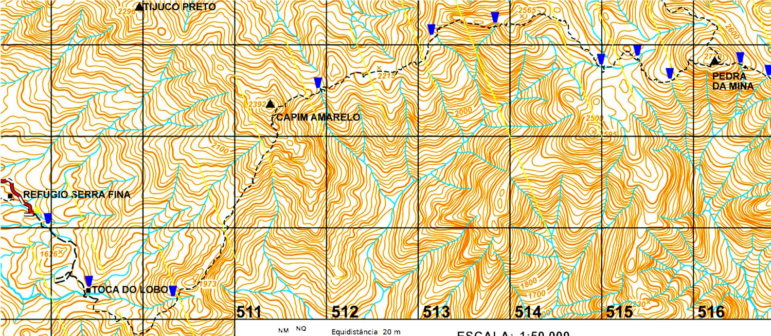 Planejamento é fundamental. Antes de pegar a trilha ou subir a montanha, você precisa saber onde encontrará água. Com uma carta topográfica, mesmo antiga, não há por que não planejar quanto de água levar e onde reabastecer. Usei esta carta para planejar minha travessia da Serra Fina em dois dias. No mapa se percebe que o maior trecho sem água tem cerca de 3 quilômetros (entre a subida do Morro do Quartzito e a descida do Capim Amarelo). A metade deste trecho é praticamente plana, no divisor de água.