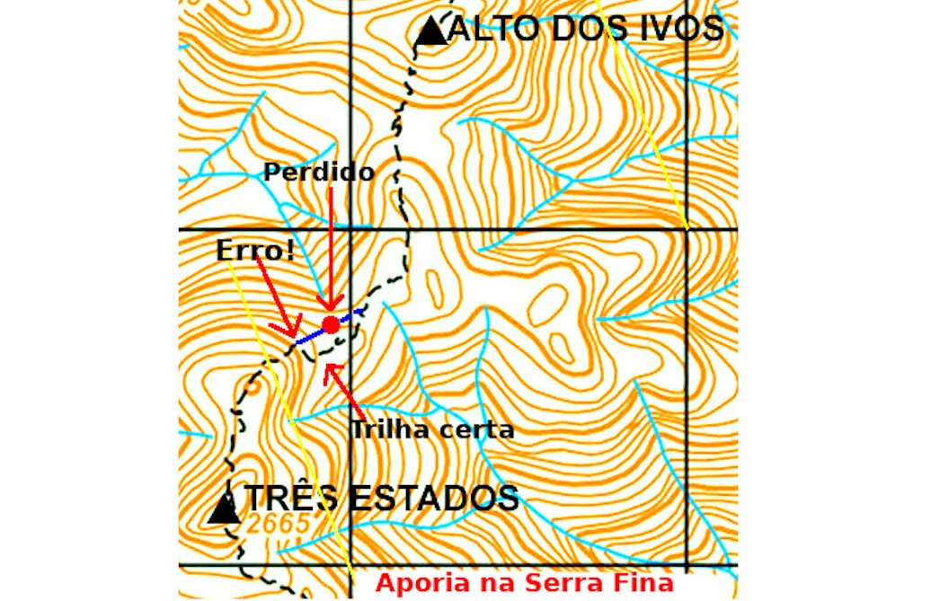 A experiência alheia é mais barata do que a nossa própria. No meu planejamento, sempre que possível, leio os relatos e analiso os registros de GPS de quem já fez a trilha antes. Isto poupa tempo, elimina erros e diminui os riscos. No caso acima, trabalhei com um arquivo GPX para retraçar a trilha. Infelizmente não mantive o nome do autor do GPX após transpor as coordenadas para a carta topográfica.