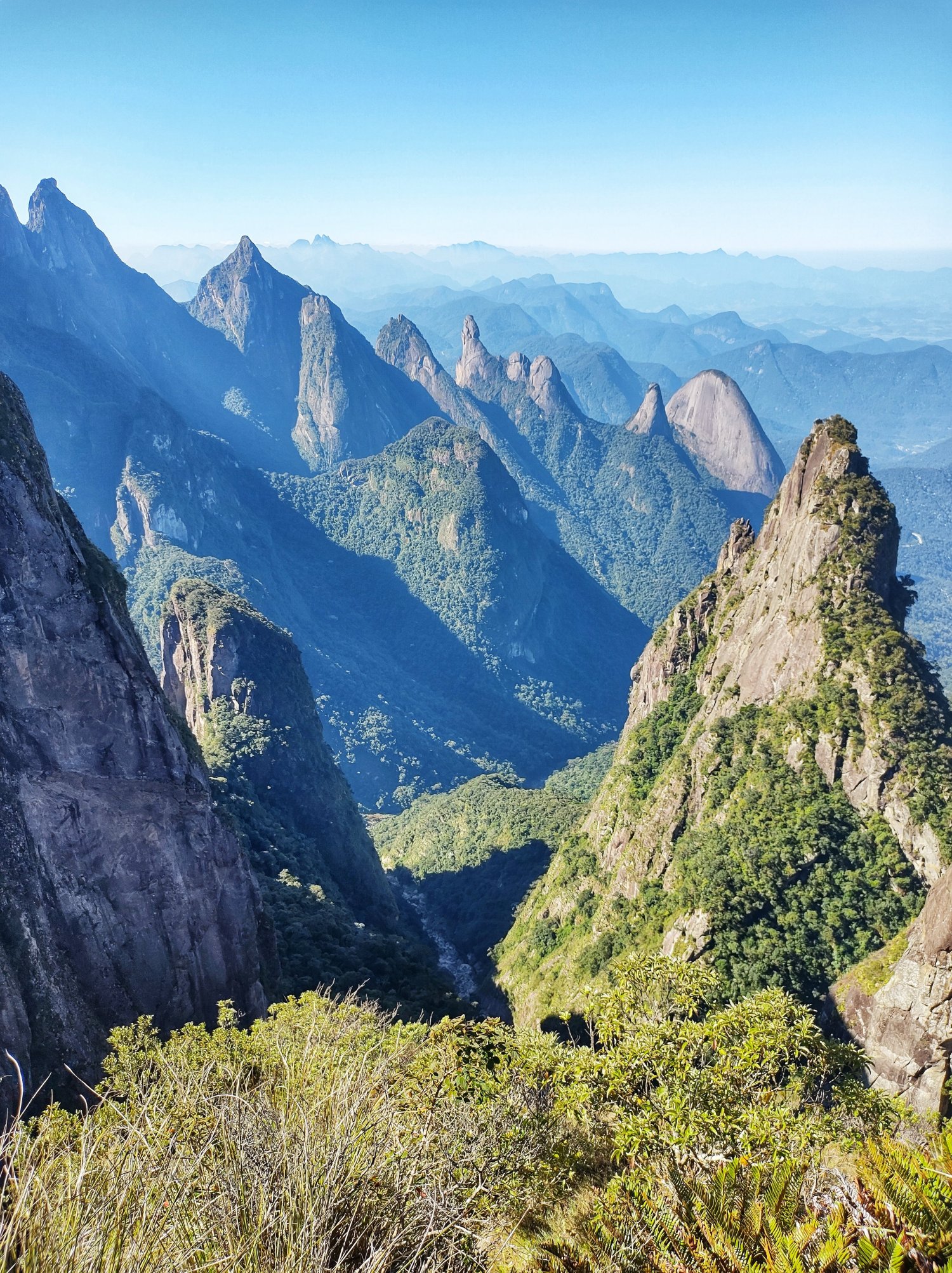 Já bem próximo dos Portais, é preciso descer com cuidado um trecho bem inclinado com terra preta e molhada. Tomei um escorregão, mas consegui me segurar em uma árvore. A queda teria sido feia. Desci com mais cuidado, atravessei o pequeno riacho e subi a outra margem, também escorregadia. Em um par de minutos estava frente a frente com um mar de montanhas.