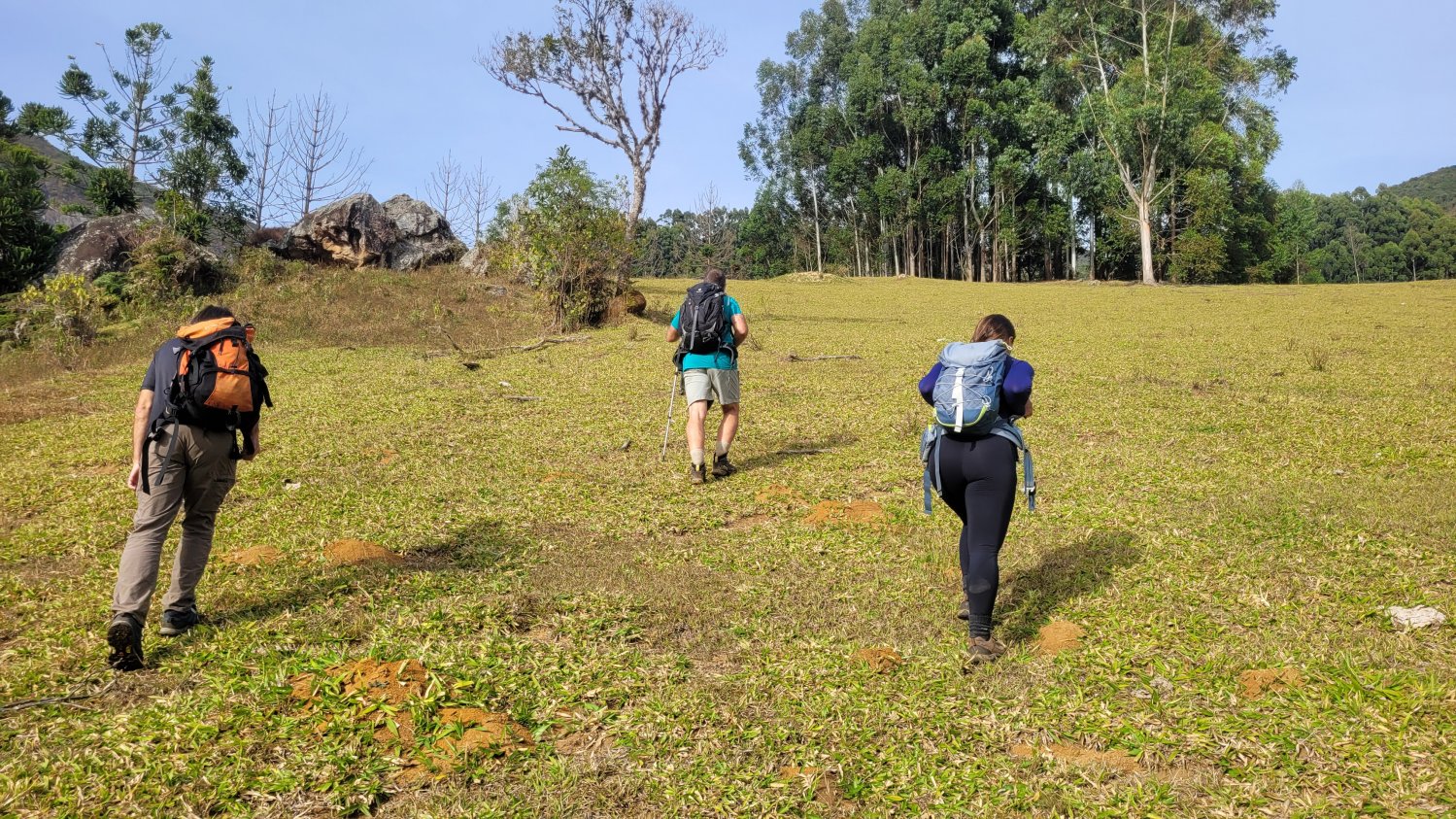 Um pouco antes de chegar em um riacho, deixamos esse caminho marcado e começamos a subir diretamente pelo pasto, em direção a um conjunto de eucaliptos, que cruzamos e interceptamos uma outra trilha um pouco a direita. Essa trilha leva a um trecho mais plano e que passa ao lado de uma frondosa árvore, que sempre foi a minha referência nessa parte da trilha.