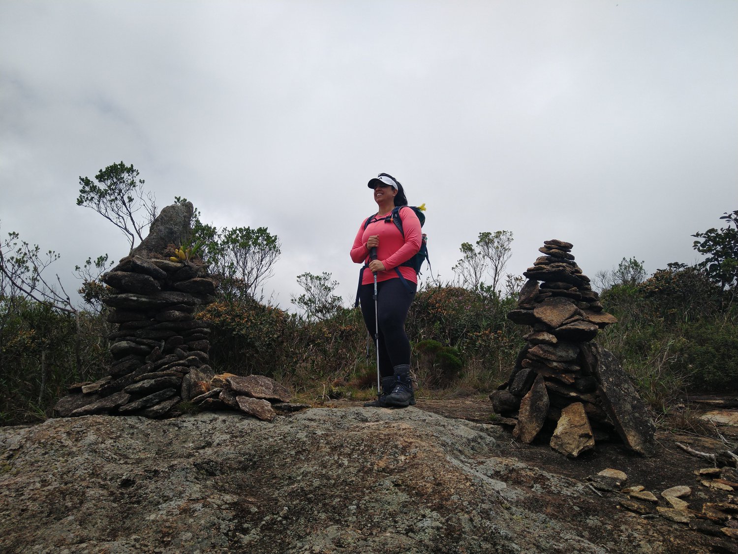 Fomos ganhando altitude até chegarmos nos trechos de laje de pedra. As fitas e o tracklog ajudam bastante nesse trecho. Aos poucos, a trilha começa a pender para a esquerda, já subindo pela crista da Jacuba Maior. Após passarmos uma laje de pedra onde existe uma grande seta “desenhada” com pedras, a trilha entra no seu trecho final, com muitos arbustos. Exatamente as 11h10 avistamos os dois grandes totens de pedra que fazem parte do cenário do cume da montanha. Lanchamos e nos hidratamos enquanto líamos os registros do livro de cume. Para nossa sorte, o tempo estava mais aberto. Tiramos algumas fotos e as 11h45 começamos a descida.