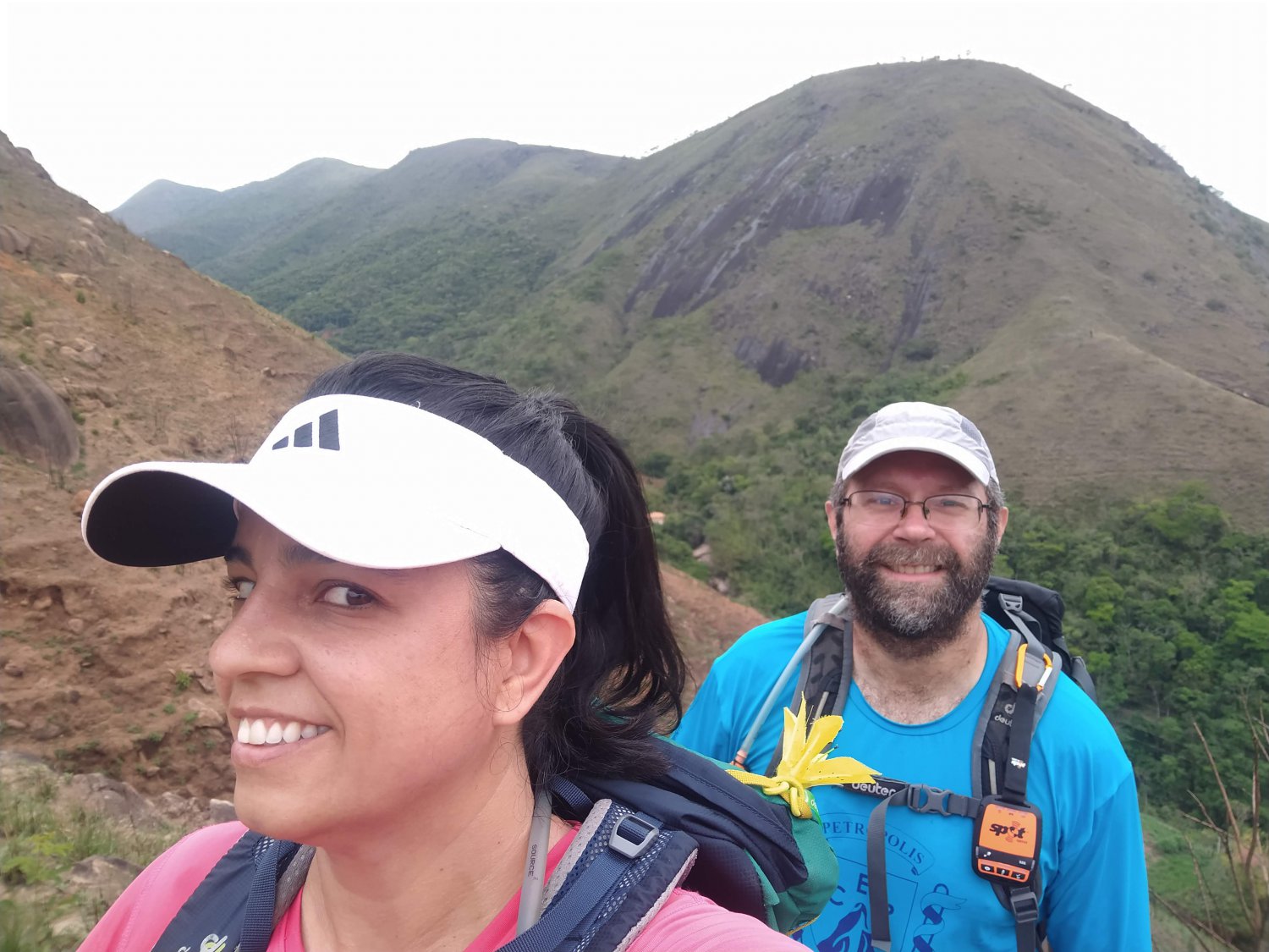 Tiramos algumas fotos e voltamos a trilha. Mais da metade do caminho é feita através desse aceiro. A inclinação continua forte e fomos avançando sem correria. O tempo continuava feio, umidade muito alta, as montanhas estavam encobertas e em alguns momentos, havia um leve chuvisco. Apesar disso, o pouco que conseguíamos visualizar era bastante bonito.
