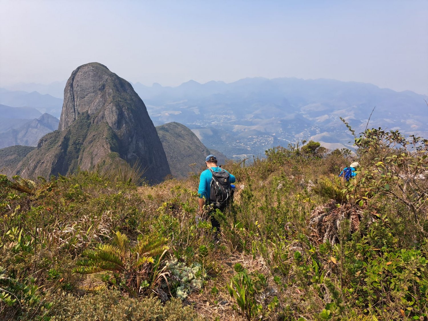 As 10h colocamos as mochilas nas costas e retomamos nossa caminhada. Voltamos um pequeno trecho de trilha e começamos a descida pela crista do lado oposto ao cume. A partir desse trecho a trilha é menos frequentada, então em alguns pontos o caminho ficava mais discreto. Mas o objetivo era chegar em um lajeado que daria acesso ao colo por onde chega a trilha que vem do Grotão (Travessia Jussara). Lembro que havia passado por ali subindo duas vezes em 2019, e sempre colocavam uma corda para ajudar. Mas sempre fiquei com a impressão que dava para passar sem ela. Quando chegamos ao lajeado, marcado por um grande totem, vimos que era totalmente possível desescalar com cuidado usando apenas os platôs de vegetação. E pouco tempo depois já estávamos no colo, com o GPS marcando 1520m. A partir desse ponto seria tudo novidade.