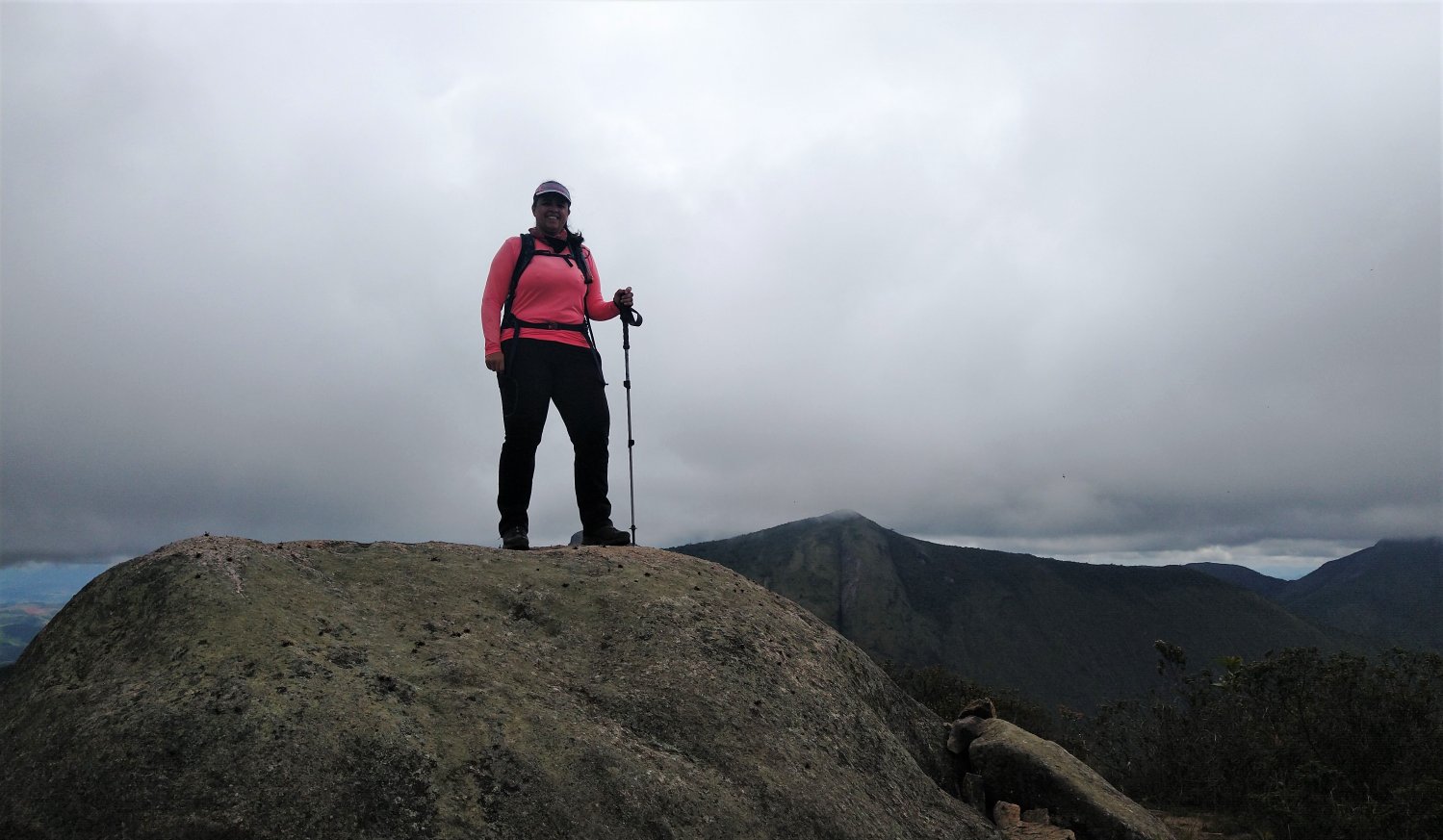 Curiosamente, o caminho correto é contornando essa laje de pedra pela esquerda. Mas demos uma rápida passada na laje para descansar um pouco, observar o que faltava até o cume, curtir a vista e aplicar mais uma dose do repelente Exposis, um dos poucos que tem algum efeito sobre os carrapatos, que infelizmente infestam o local. Definitivamente, não é uma boa época para fazer essa trilha.