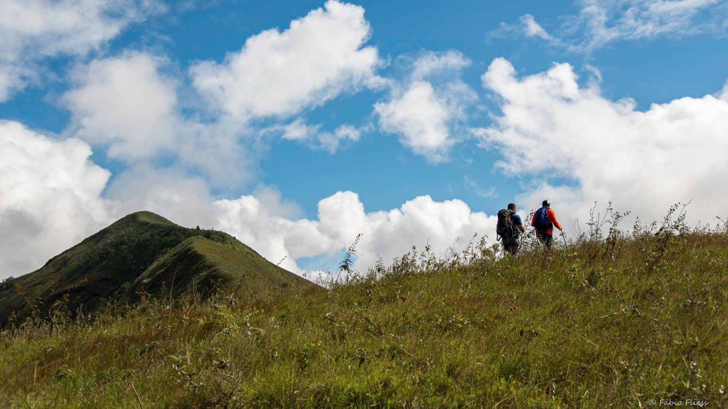 Mesmo com mato alto, a calha da trilha é bem visível. Logo na primeira curva, atualmente existe uma confusão de caminhos. A trilha original tende para a esquerda, atravessando um capinzal e subindo por um barranco até chegar em um aceiro. Recentemente, por conta da captação de água pelos moradores, foi aberto outro caminho, bastante inclinado, mas bem limpo. Dessa vez, optei por seguir esse caminho novo.