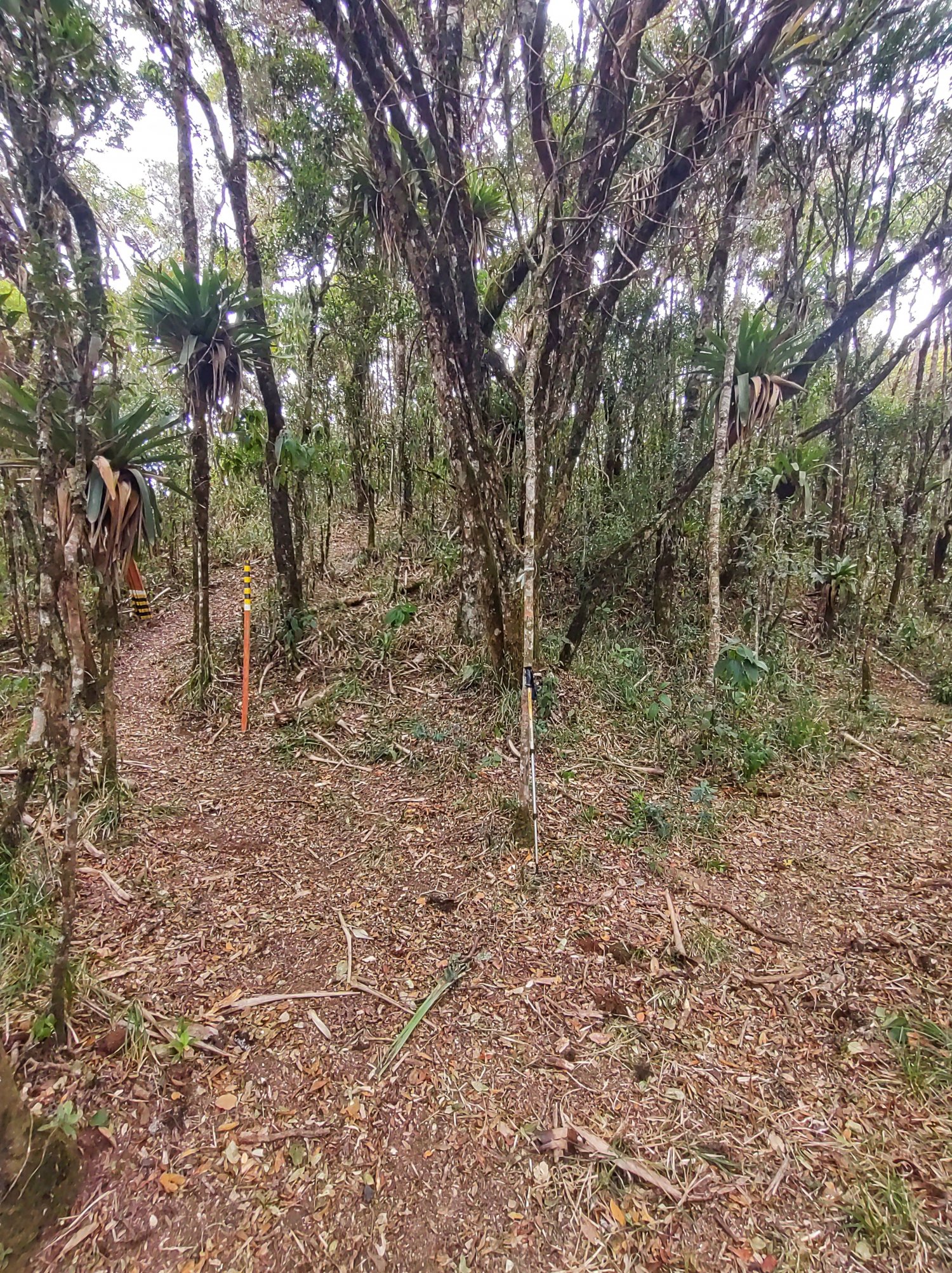 A primeira parte da trilha é comum a travessia, e é quase uma avenida. Com cerca de 20 minutos chegamos em uma bifurcação. Quem segue para a travessia, pega o caminho da esquerda. Nós seguimos reto, entrando em um bonito trecho de mata. A trilha desce um pouco, passa por um riacho com uma porteira e logo volta a subir. Boa parte da trilha é feita dentro da mata, o que ajuda bastante em dias de sol forte. Pudemos ver que a trilha teve uma manutenção recente e vem sendo sinalizada com estacas nos pontos que podem gerar dúvidas.