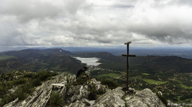 Subimos lentamente, tomando cuidado para não escorregar. As 11h40 chegamos ao cume, onde encontramos uma nuvem de mosquitos. Ficamos pouco tempo no cume, tamanha a perturbação desses bichos. Tirei algumas fotos do cruzeiro com a represa ao fundo, da Letícia e da Alessandra e pouco depois já iniciamos a descida.