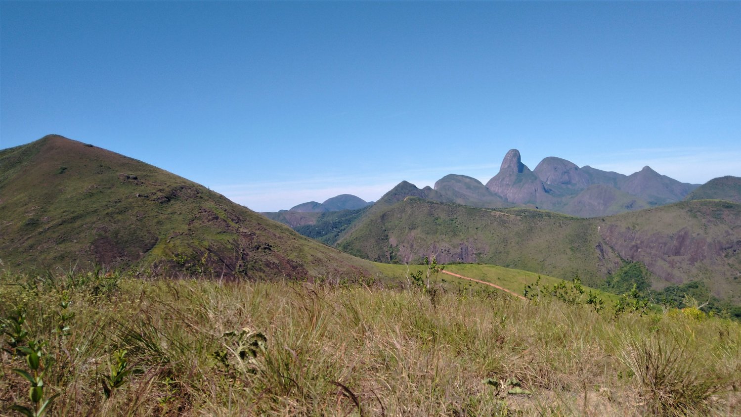 Um capim baixo tomou conta do espaço e em alguns trechos, quase não se enxerga a trilha, mas a calha estava bem marcada. A minha frente, no horizonte, várias montanhas da Serra dos Órgãos. Olhando para trás, outras montanhas imponentes como o Taquaril e as Jacubas.