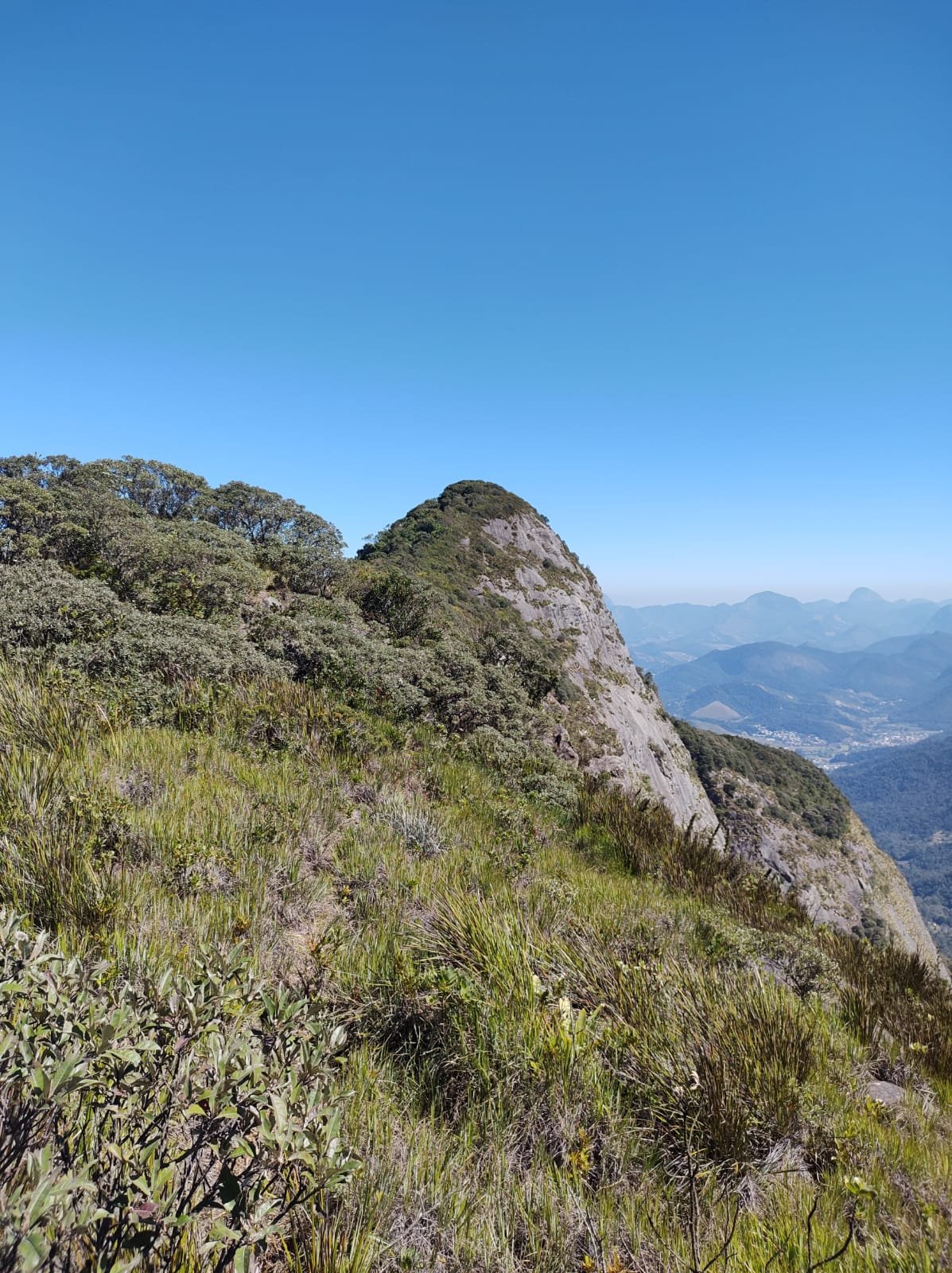 Aproveitamos uma laje de pedra para descansar, hidratar e fazer um pequeno lanche. Ao lado de onde estávamos, havia um livro de cume que assinamos e pudemos comprovar a baixa visitação dessa trilha. De onde estávamos, podíamos ver o que ainda teríamos que encarar: o Nariz e o Queixo. Ficamos cerca de 15 minutos descansando antes de voltar a caminhar.