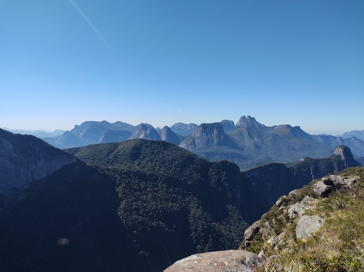 Inicialmente, pegamos mais uma ligeira descida para voltar a subir entre alguns lajeados, que ajudavam nossa caminhada. O calor já era grande, mas fizemos poucas paradas até chegarmos nos 1930m do Queixo, as 12h15. A vista era deslumbrante: ao lado do Seio, uma infinidade de montanhas como Mirante do Frade, Torres de Bonsucesso, Torre Oculta (Panorama a Bessa), Cabritos, Duas Serpentes, D’Antas, Palmital, Filhote de Anta, Toledo ou Ronca-Pedra, Cabeça de Dragão, Branca de Neve, Sanhaço do Frade, Três Picos, Três Municípios e um pouco mais destacado, o Morro do Carmo. É muita montanha!