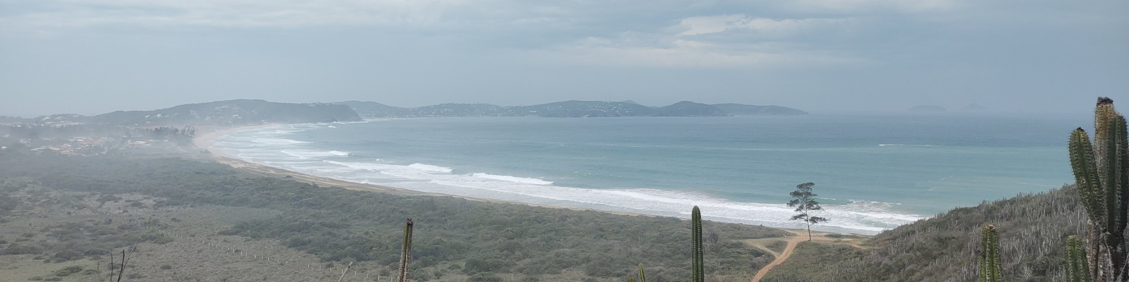 Quarenta minutos depois de iniciarmos a caminhada, passamos por uma porteira aberta. Ali apareceu a primeira e única subida mais íngreme que foi vencida rapidamente. No final da subida, a trilha fica exposta ao sol, expondo bonitas paisagens para as bandas de Cabo Frio.