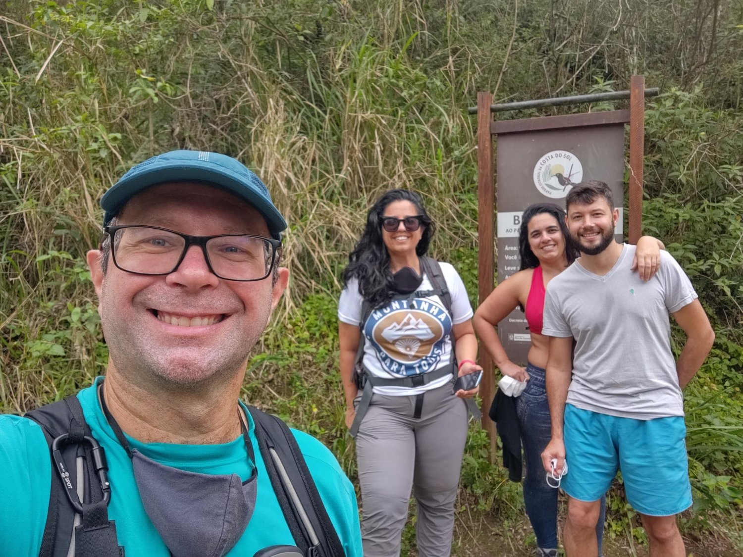 Durante o café da manhã, a Júlia e o Octávio comentaram que poderiam nos deixar no início da trilha e nos esperar na praia de Tucuns. Assim poderíamos atravessar a serra, fazendo uma pequena travessia. E assim ficou combinado! Nos esprememos em um único carro e seguimos para o bairro de José Gonçalves, onde começamos a caminhada, bem em frente ao Condomínio Linguado 2, exatamente as 12h, com o tempo encoberto e muita umidade.