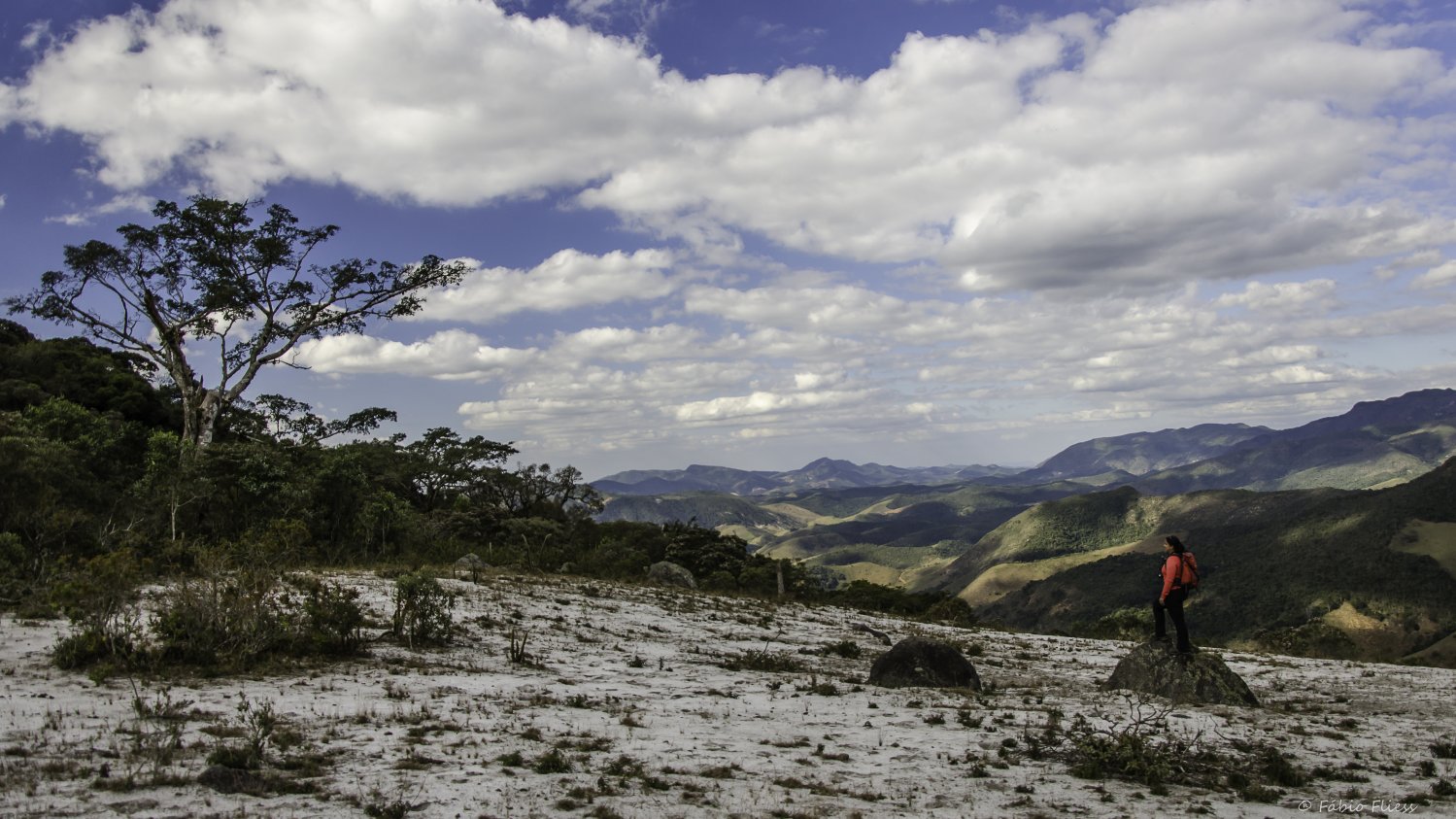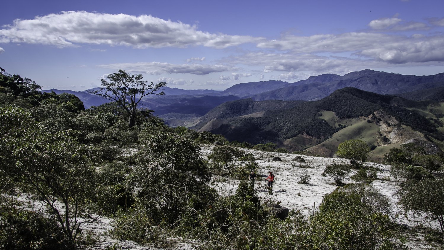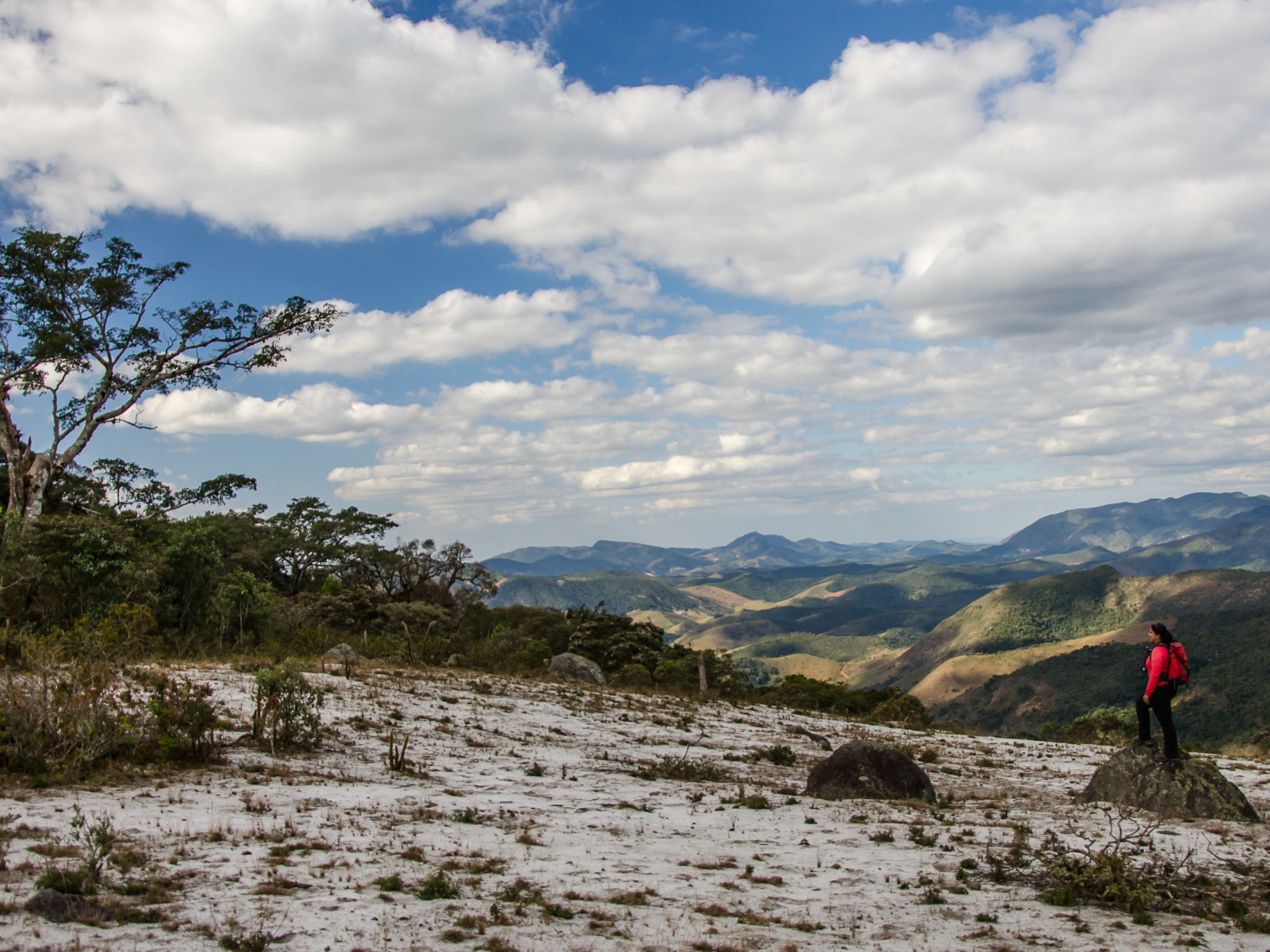 Fizemos um ligeiro desvio para a direita e passamos por uma cerca de arame farpado, com a colaboração dos colegas de trilha. Logo chegamos num dos pontos mais bonitos da trilha, com uma grande área coberta por areia branca. A nossa frente, outras bonitas serras da região, como a Serra Negra e a Serra do Cruz.