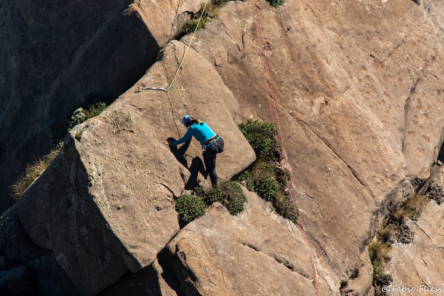 O Luiz Cláudio rapidamente iniciou a escalada, colocando estribos para facilitar a passagem pelo artificial, enquanto o restante do pessoal se preparava. Eu fiquei posicionado em um mirante um pouco acima da base, fotografando a galera escalando.