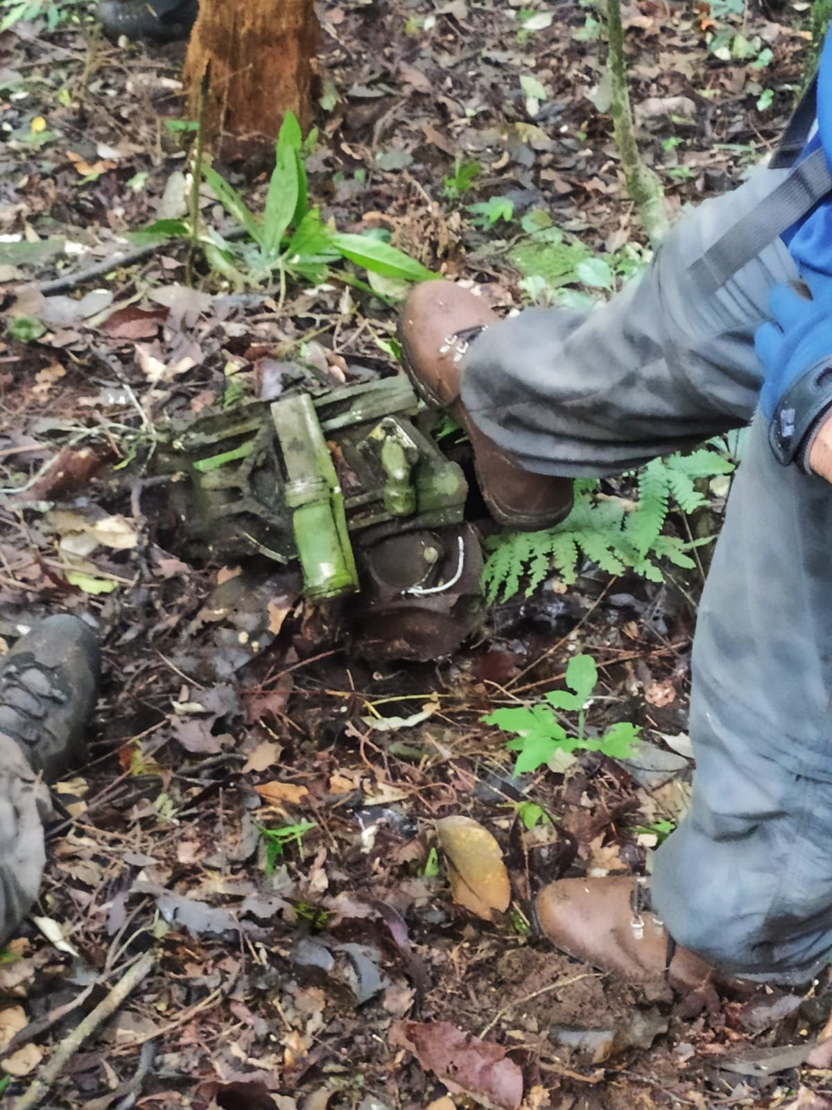 Retornamos pelo mesmo caminho até o colo, onde continuamos a descida. Em alguns trechos a mata facilitava a locomoção e o ritmo melhorava, mas logo aparecia um trecho para batermos facão. Em pelo menos dois pontos, encontramos restos do trem de pouso do avião cargueiro da Lufthansa (LH527) que bateu naquelas encostas em 1979.