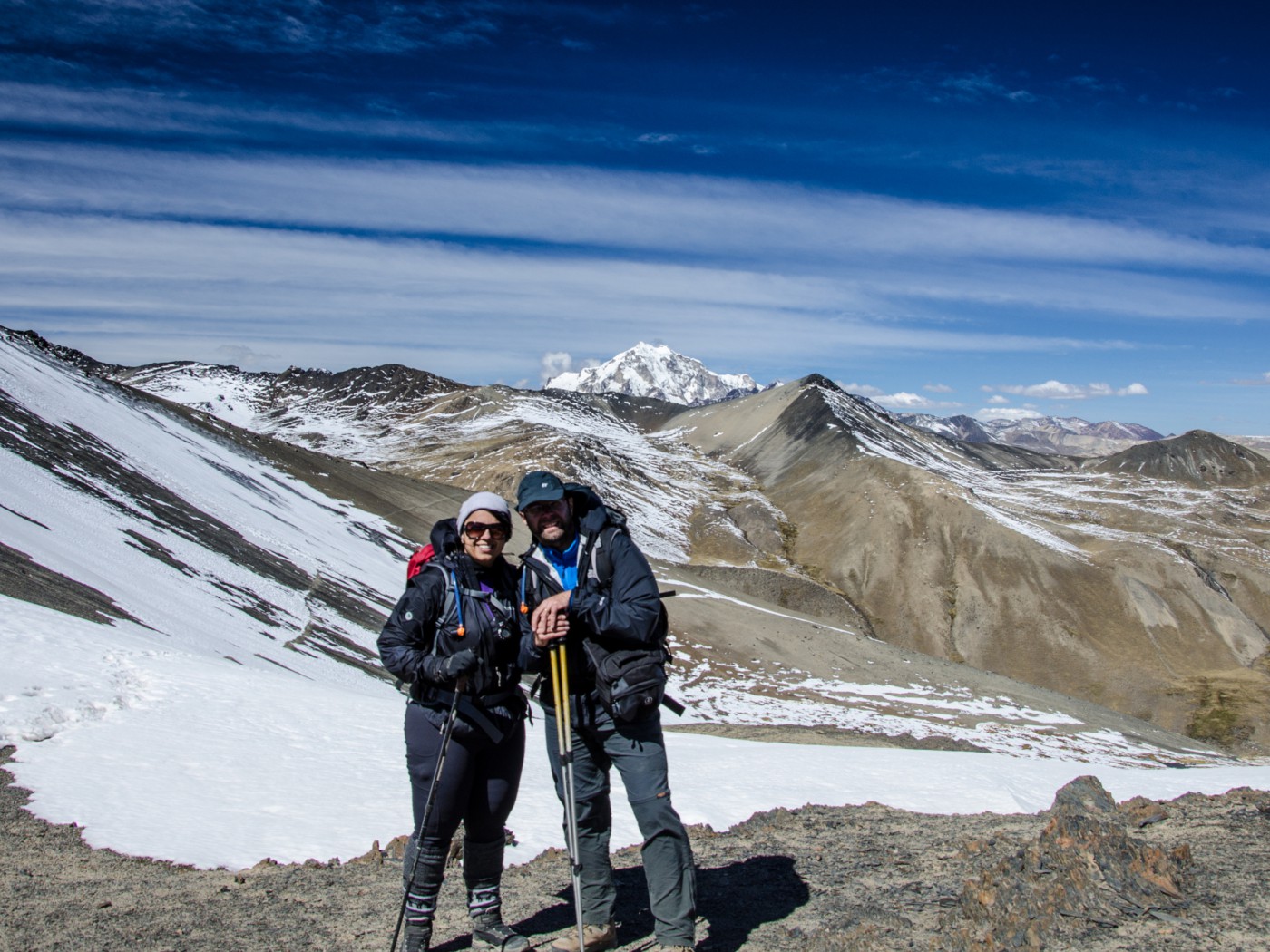 A Letícia estava bem cansada e começou a sentir tonturas, parando cada vez mais. Com um pouco de dificuldade, conseguimos chegar ao passo do dia (Apacheta Pass – 5150m). A Letícia optou por ficar descansando nesse ponto, enquanto eu e o guia subimos o Pico Áustria (ou Apacheta Peak – 5330m). Levamos cerca de 35/40 minutos para chegar ao cume de onde temos uma linda vista, que alcança até o distante Lago Titicaca. O Huayna Potosi mostrava sua grandiosidade e podíamos contemplar os vários nevados que rodeavam o Condoriri.Tirei algumas fotos e logo começamos a descer por um caminho um pouco diferente da subida. Era praticamente uma linha reta, afundando os pés nas pequenas pedras que estavam na encosta da montanha. Logo abaixo, interceptamos a trilha de subida. Reencontramos a Letícia no passo, já mais descansada.