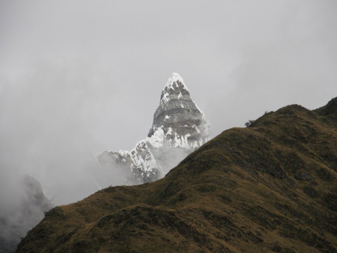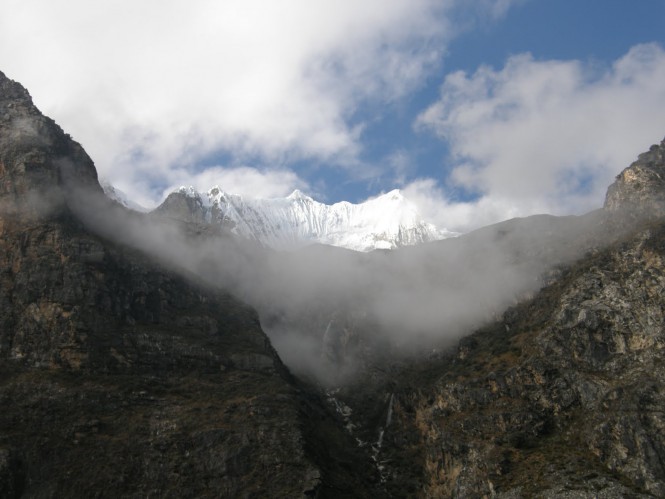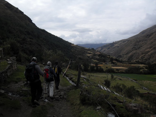 Depois do café da manhã e com os equipamentos devidamente arrumados, seguimos em direção ao povoado de Huaripampa. A maior parte do trajeto é uma descida bastante suave, tendo várias casas ao lado da trilha. Um pouco antes de chegar ao povoado, depois de uma subida mais forte, paramos para tomar fôlego e a visão que tivemos quase minou o que restava dele: uma visão fantástica do nevado Chacraraju.