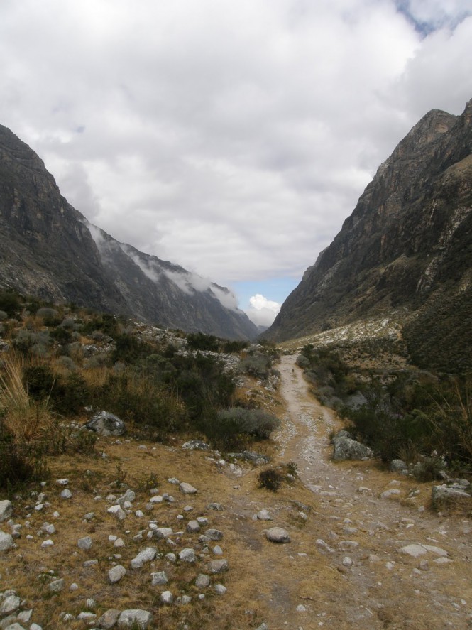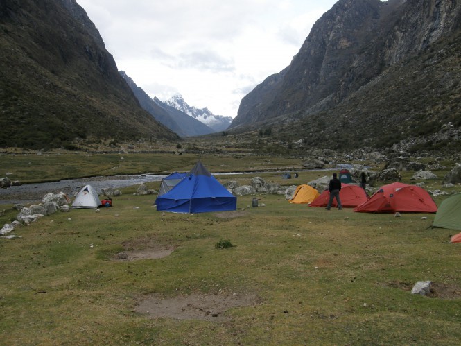O objetivo desse primeiro dia era chegar ao acampamento de Llamacorral, localizado a 3760m de altitude, numa caminhada que dura entre 5 e 6 horas. Durante todo o tempo caminhamos ao lado de um bonito rio, avançando cada vez mais pela Quebrada Santa Cruz.