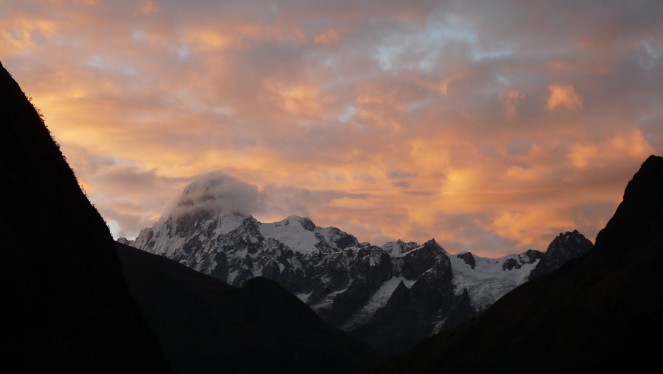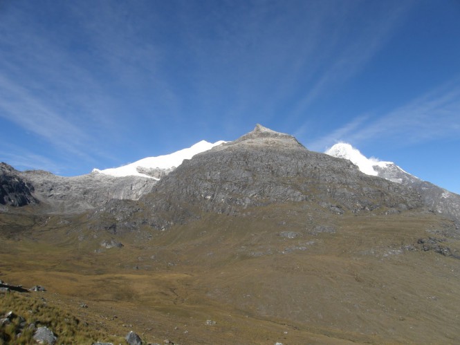 Do seu lado esquerdo, você verá o imponente Huascarán (6664 no cume norte e 6768m no cume sul) e o Chopicalqui (6354m), e do seu lado direito, estão os quatro cumes do Huandoy (o maior deles com 6395m), o Pisco (5752m) e o Chacraraju (6112m). Impossível não parar para tirar muitas fotos.