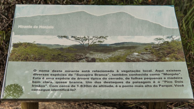 As 9h10 saímos do estacionamento em direção a trilha, caminhando primeiro em uma estrada até uma casa de apoio do parque. A partir dali temos a subida mais forte do dia, até o Mirante do Monjolo onde podemos vislumbrar um pouco abaixo o Córrego das Éguas, um importante afluente do Rio Preto, e logo a frente, o Morro Dois Irmãos (ponto culminante do parque, com 1825m de altitude).