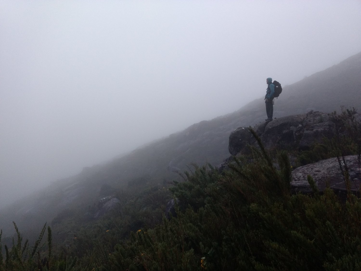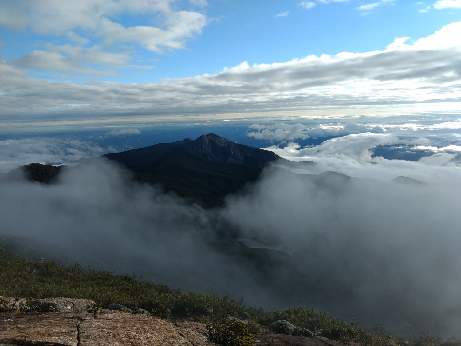 Por mais que a neblina estava densa no pico, nos esperamos e tomamos café. Depois de 1 hora, a neblina começou a sumir e assim mostrou a paisagem maravilhosa e impactante que podemos ver do Pico da Bandeira.