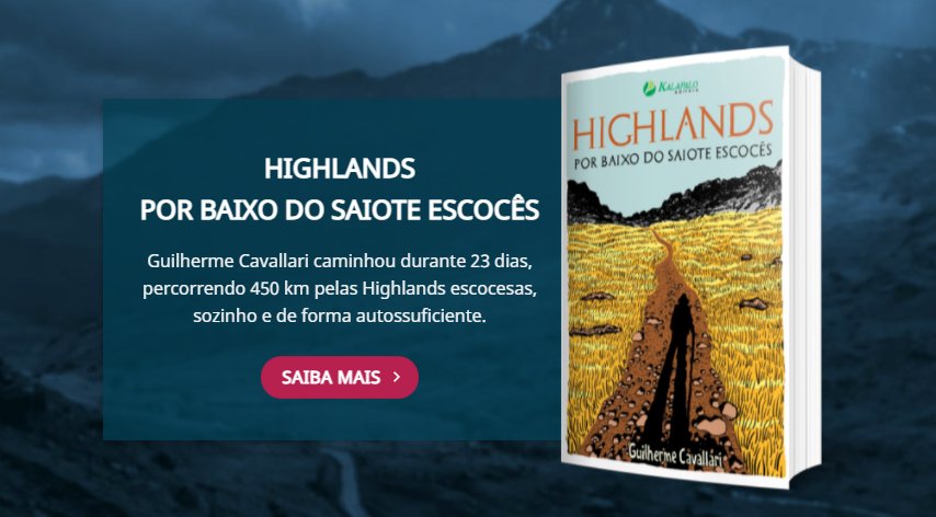 Temos muito orgulho em dizer que contamos com uma livraria especializada no segmento outdoor, com títulos e autores consagrados. Em destaque, por exemplo, está o livro “Highlands – Por Baixo do Saiote Escocês” de Guilherme Cavallari, da Editora Kalapalo. Nele, o autor escreve a história de sua aventura de 450 km de extensão sozinho e de forma autossuficiente, caminhando 23 dias e cruzando praticamente toda a distância sul-norte das Highlands da Escócia.
