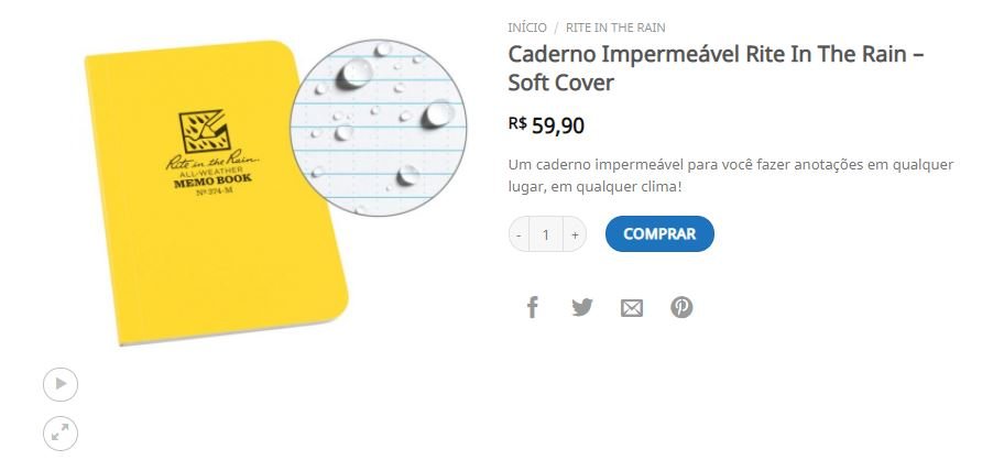 Nós vendemos também o caderno impermeável Rite in The Rain. Resistente à chuva, suor, água, lama, óleo, graxa, etc. Ele é ideal para fazer anotações durante suas aventuras, trabalhos, estudos de campo, viagens e no dia a dia. Em nossa loja, ele está disponível em diversos tamanhos e modelos diferentes. ENTRE E CONFIRA!