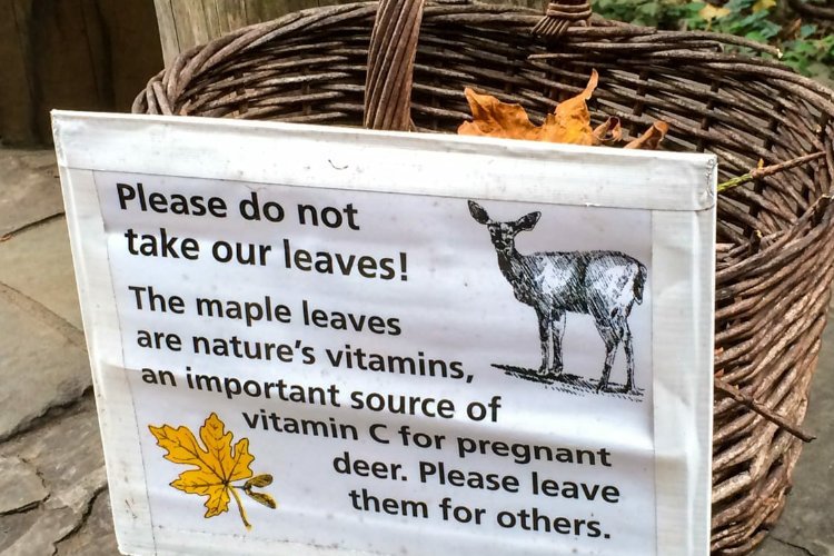 Não colete pedras, flores, folhas ou galhos. Na foto um alerta avisando que as folhas são uma fonte importante de vitamina C para os cervos em gestação.