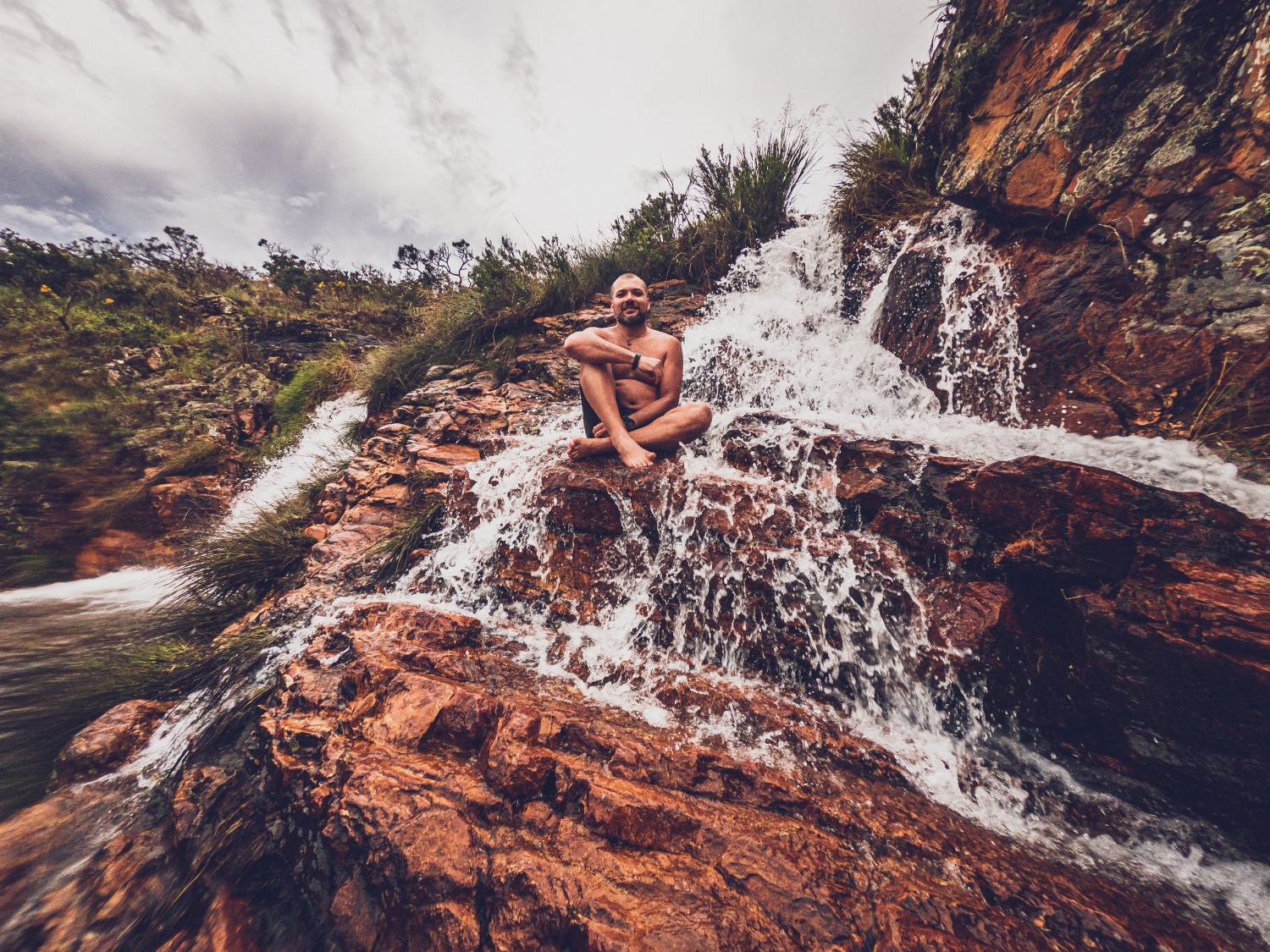 A chuva mais forte já caía, hava muita lama e empurra-bike. Atravessamos um córrego com água gelada na coxa, pedalamos até mais um morrinho e demoramos um pouco até encontrar a trilha que leva à cachoeira do Bárbaro. Para facilitar a caminhada final até lá, escondemos as bikes e fomos a pé mesmo os últimos 200m. Enfim chegamos sequência de saltos, poços e mini quedas. Demoramos pouco pois o local estava perigoso para banho por causa do risco abrupto de enchente, e também a noite ja dava sinais. Mas tempo suficiente para um banho rápido, um lanche e claro, uns beijos :)