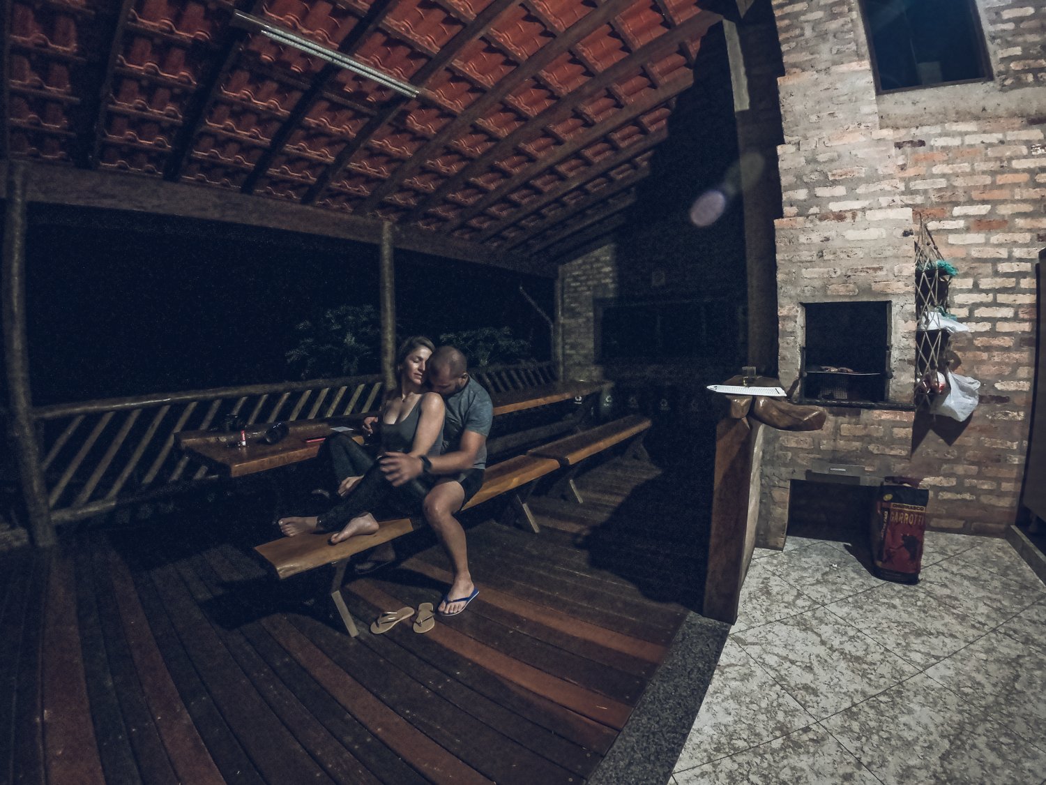 Só sei que depois de algumas horas pedalando no temporal, chegamos de volta à vila. Tomamos nosso merecido banho de água limpa, pusemos uma roupa quente e preparamos nosso jantar com direito a um macarrão altamente salgado com churrasco e cerveja. E voltando ao papel masculino, eu não estava ali à toa. Estava decidido a pedir a Patrícia em namoro por vários motivos que julguei que deveria ser assim. E para isso, preparei um candelabro com uma forquilha e latas de cerveja e mandei: "-Você aceita ser minha namorada?". E ela: "-Sim!".