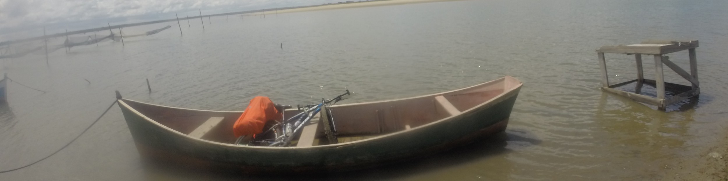E entrou para dentro da casa. Eu não tinha certeza se tinha escutado direito, achei o rio meio desafiador e fiquei com receio de despertar a ira do pescador pegando o barco dele sem autorização. Fiquei ali com cara de tacho pensando no que fazer até que ele apareceu de novo, gritou umas palavras que não entendi, mas que pareciam dizer para eu ir mesmo. Na pressa não quis desmontar os alforjes da bicicleta e foi duro colocá-la com todo peso para dentro do barco. Como o rio era raso, o esquema era empurrar o barco com uma taquara até o outro lado, sem remo. A maré tinha subido e o mar estava botando para dentro da lagoa, me empurrando para as armadilhas. Comecei empurrando pela popa e não conseguia direcionar, mas me espertei a tempo de correr para a proa e evitar o desastre eminente, retomando o controle do barco. Na chegada ainda levei um tombo, perdi o equilíbrio enquanto erguia a pesada bicicleta e ao mesmo tempo espantava o caranguejo que tentava beliscar meu pé descalço. As únicas testemunhas foram dois cavalos, então conservei meu orgulho intacto.