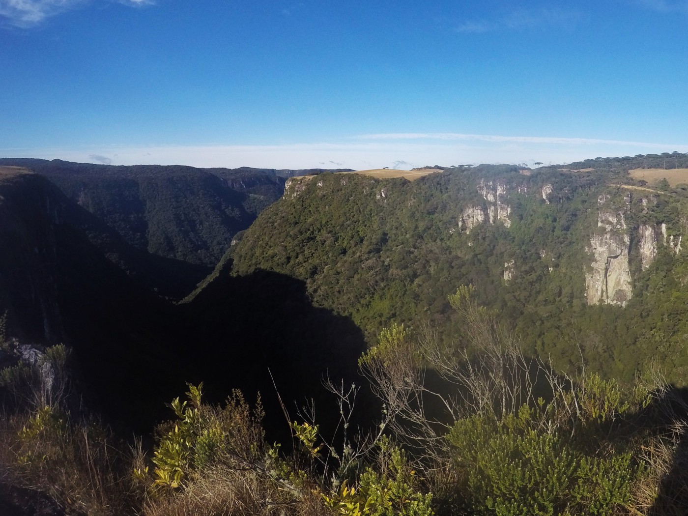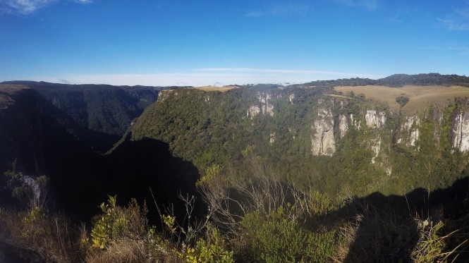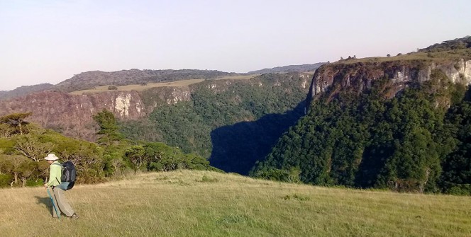 Você vai seguir por algumas trilhas mais fechadas até chegar em um novo campo. De lá, é possivel ter acesso a um mirador para a face leste do cânion Pedras Brancas e para o vale da cidade de Itati.