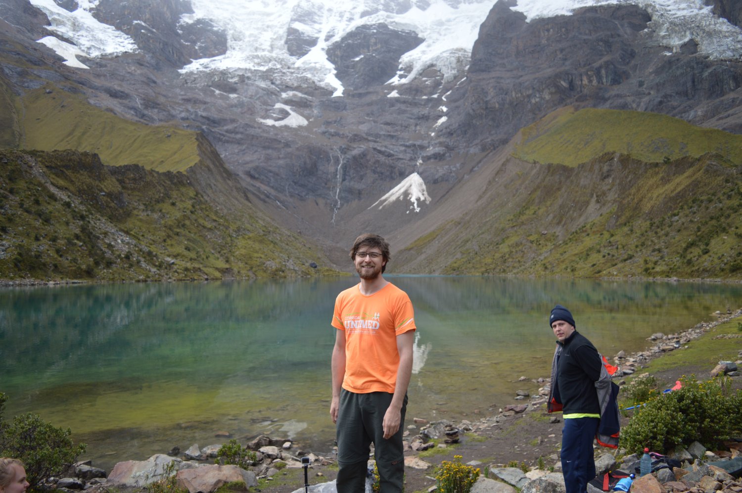 Após chegar em Soraypampa (3.900 m), temos tempo para organizar as coisas na barraca, já montada, e logo é servido o almoço. Nos almoços no Peru geralmente é servida uma entrada, sopa, e após o prato principal. O Peru por ser um país com grande variedade de batatas sempre nas refeições tem esse tubérculo. Após o almoço é servido um chá de coca ou menta, para ajudar com o mal de altitude. Já alimentados temos tempo para descansar, cerca de 40 minutos e em seguida quem tiver disposição pode seguir até o Humantay Lake, cerca de 1:30h de caminhada íngreme até 4300 m, serve de treino para o 2º dia de caminhada, o mais difícil. Durante o descanso cai uma chuva forte, colocamos a capa de chuva e seguimos. A subida é íngreme e longa, porém em 1h estamos apreciando a maravilha do lago com cores azuis e verdes, e de brinde a montanha com neve ao fundo.