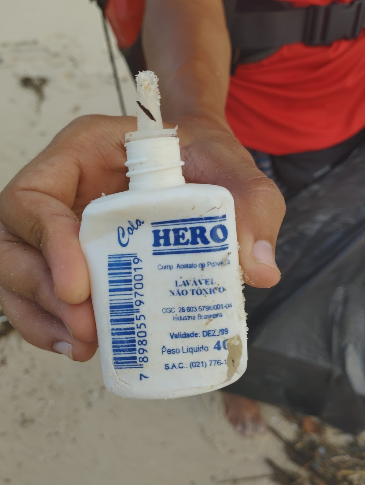 Lixo recolhido na Praia do Sul: um frasco de cola escolar cuja data de validade é de 1999.