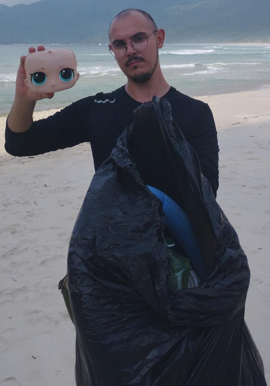 O parceiro Rafael Beraldo com seu saco de lixo e a cabeça de uma boneca que, sabe-se lá Deus como, foi parar ali.