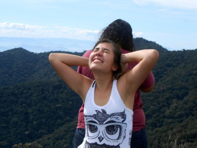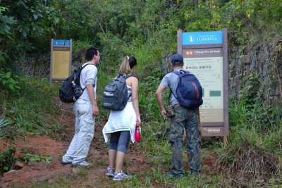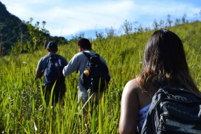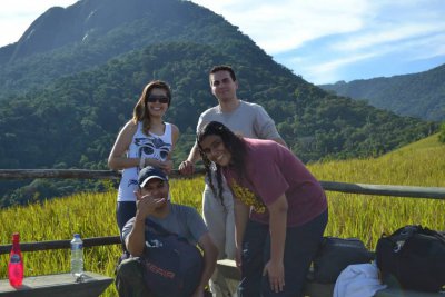 Nossa primeira trilha. Os integrantes Marcelo, Tabata, Janaira e Wesley encaram um dos picos mais importantes de Ilhabela.
