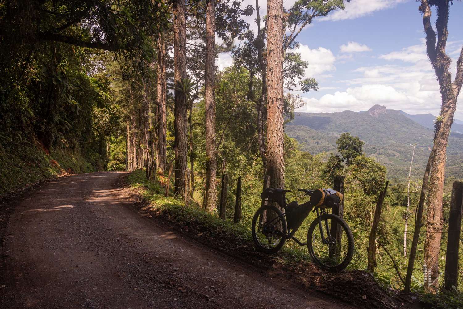 Saindo do Parque das Aves, as coisas começaram a ficar realmente desgastantes. Além do Sol escaldante, era só subida, uma atrás da outra, íngremes, sem fim. O Carlão empurrava quase o tempo todo, e mesmo estando com uma bike mais adequada, as malas (no guidão e no selim, estilo bikepacking), faziam um peso extra que me colocava na mesma situação de empurrar morro acima, parando de tempos em tempos.