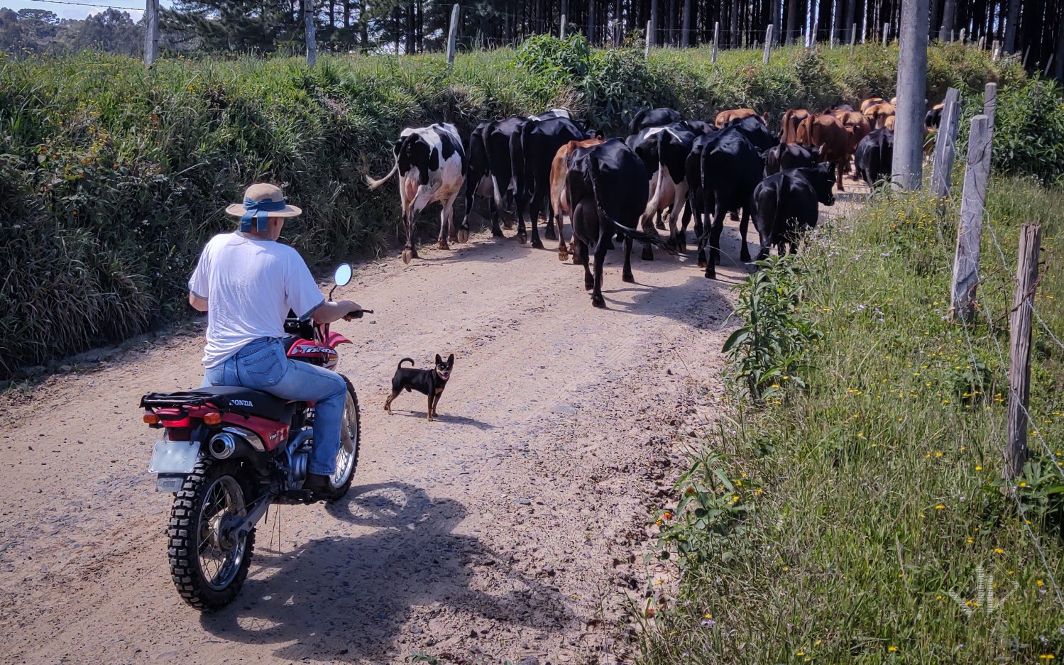 Atrás vinha a boiadeira, de moto, buzina no lugar do berrante. Tempos modernos.