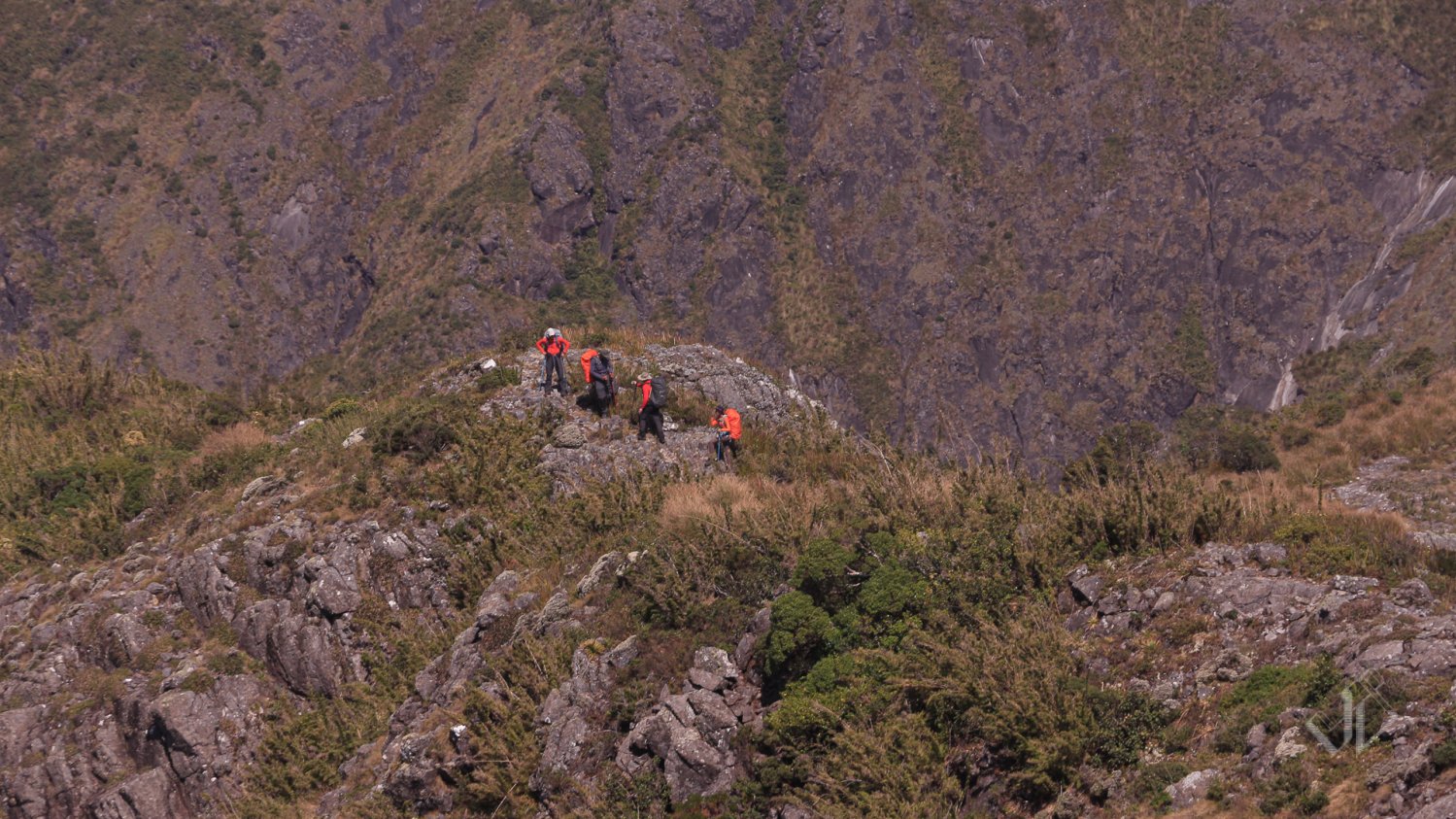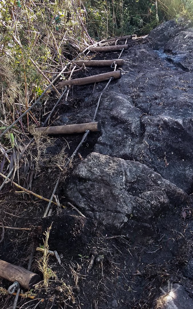 Ali o grupo me alcançou novamente e seguimos mais ou menos próximos até mais um bambuzal confuso. Dessa vez o guia estava me esperando pra apontar por onde ir. Realmente não era muito óbvio e agradeci pela dica. Seguiu-se um sobe desce por alguns morros e uma escalaminhada divertida até o Pico dos Três Cumes. Ponto do terceiro pernoite e divisa dos estados de São Paulo, Minas Gerais e Rio de Janeiro.