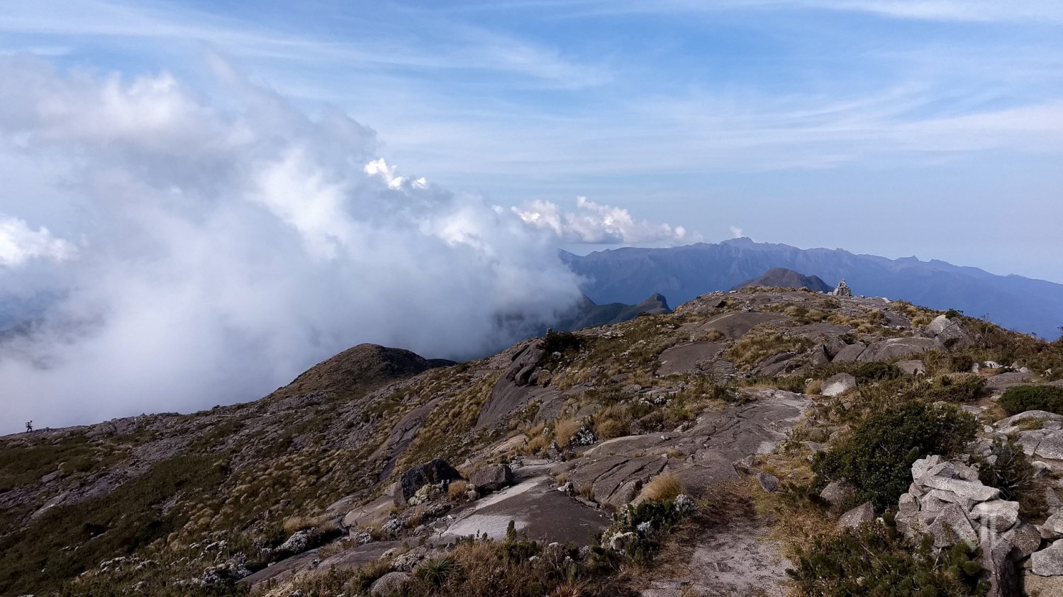 Após umas duas ou três horas de subida, solitário, a neblina arrefeceu e pude ver na subida da montanha seguinte o Samuel passando por um grupo de mais 4 pessoas. Me senti um pouco frustrado, pois queria mesmo era ficar sozinho. Quando alcancei o grupo, o guia (ou o mais experiente) deles, me cumprimentou e perguntou se eu estava bem. Trocamos algumas amenidades e continuei a todo vapor. Realmente não queria papo.