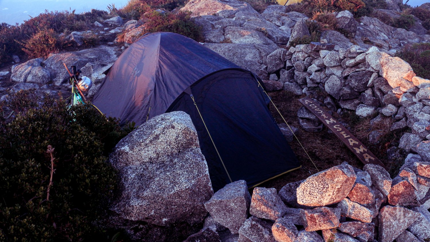 Passei voando pelo grupo e às 15h já estava com a barraca montada no melhor ponto possível, cercado por pedras, protegido do vento, e com espaço pra cozinha e até um “banquinho” improvisado. Um luxo. Assinei o livro de cume e deixei uma dedicatória pro meu pai. Chorei sozinho ali. Não só por isso, mas também por tantas outras dificuldades que aconteceram nos anos seguintes e que não tinha tido tempo pra lamentar. Logo ouvi outros grupos chegando e se instalando. Lotou.